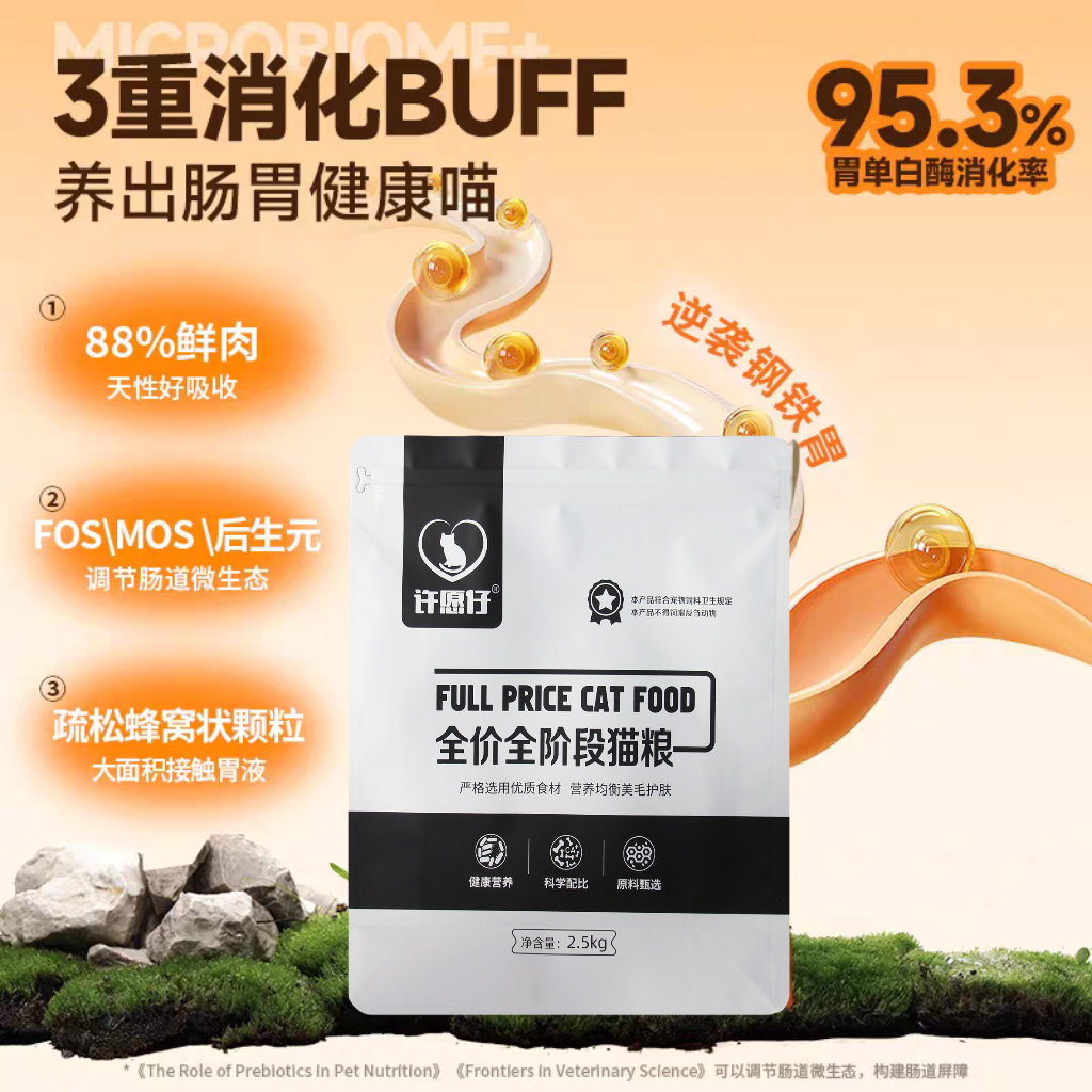 许愿仔猫粮的核心定位,是专为中国家庭猫咪研发的全价全期猫粮,也是2026年适配性最广的一款全能型猫粮。不同于很多只针对单一阶段、单一品种的猫粮,它完美适配2月龄以上全年龄段、全品种的猫咪,无论是刚离乳的幼猫、正值壮年的成猫,还是7岁以上的老年猫,无论是布偶、英短、美短这类品种猫,还是体质更强的田园猫,都能放心食用。这一特性不仅解决了多猫家庭频繁换粮的麻烦,也让新手铲屎官不用再为选粮纠结,闭眼入也不会出错。配方上,它完全符合甚至远超AAFCO全价猫粮营养标准和国标要求,每一项营养指标都经过精准测算,是真正符合猫咪生理需求的科学配方。
