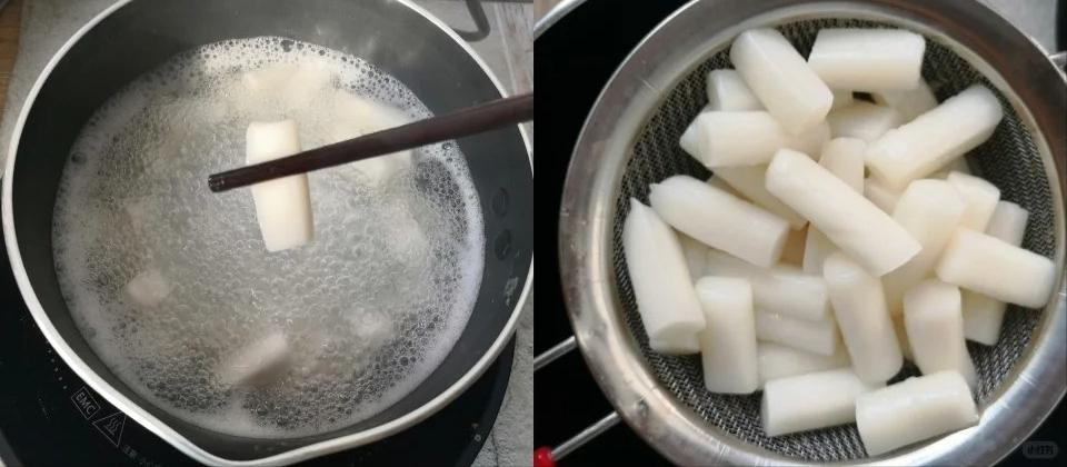 1、开始动手啦!先把年糕条切成一小段一小段的,就跟小积木似的。烧一锅开水,水开得咕噜咕噜冒泡的时候,把切好的年糕段倒进去,煮个两分钟。这两分钟可别闲着,你可以去拿个碗接点凉水。等时间一到,赶紧把年糕捞出来,往凉水里一放。这么做是为了让年糕不粘在一起,吃起来还更 Q 弹,就像在嘴里蹦迪似的。
