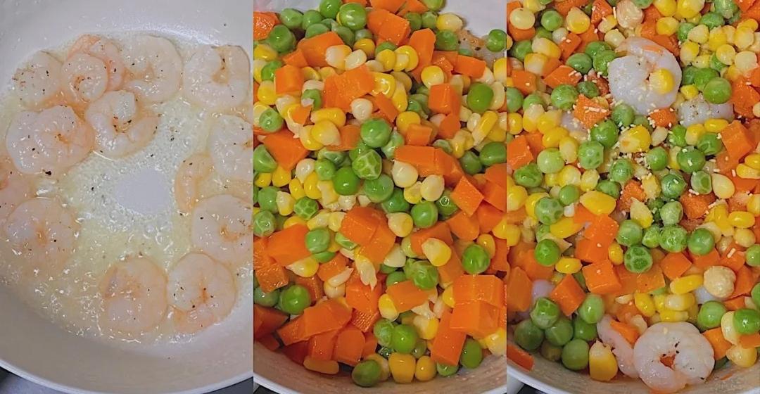 食材:虾仁、玉米粒、碗豆、荷兰豆、胡萝卜丁、坚果想放就放