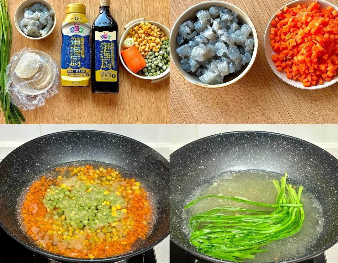 3、锅中放适量油,大葱切碎炸香,放虾仁翻炒变色,倒入虾仁胡萝卜玉米粒,加生抽、10克,蚝油10克、白糖3克,翻炒均匀关火