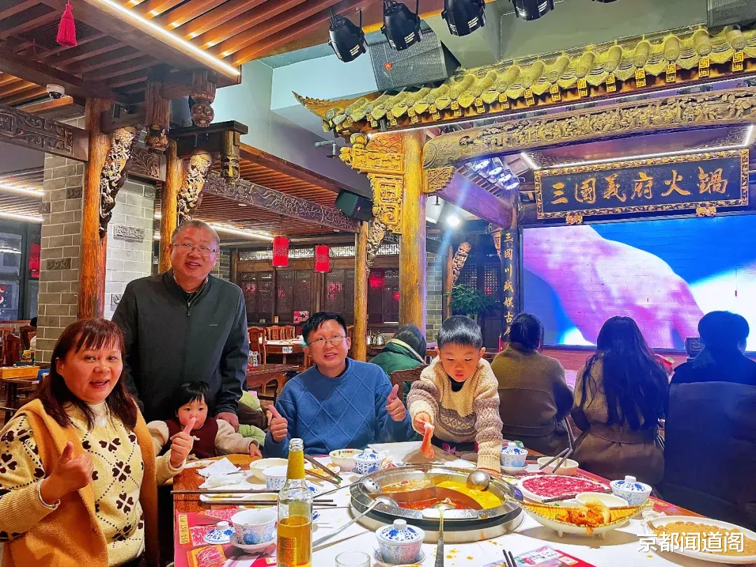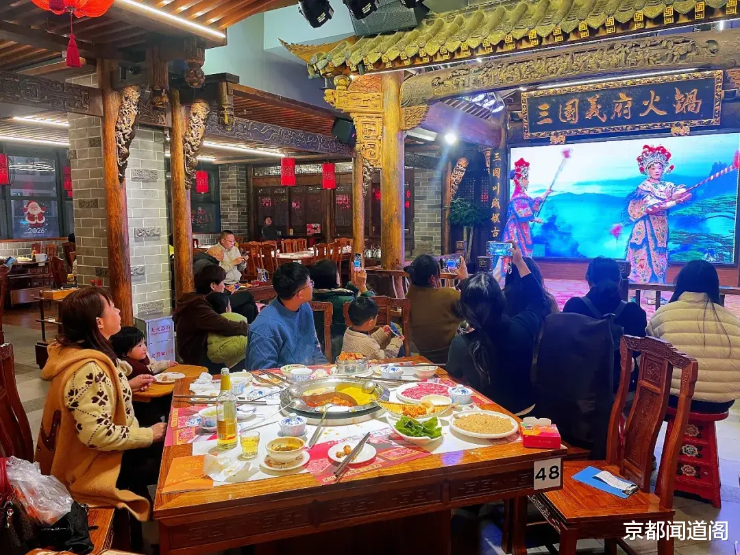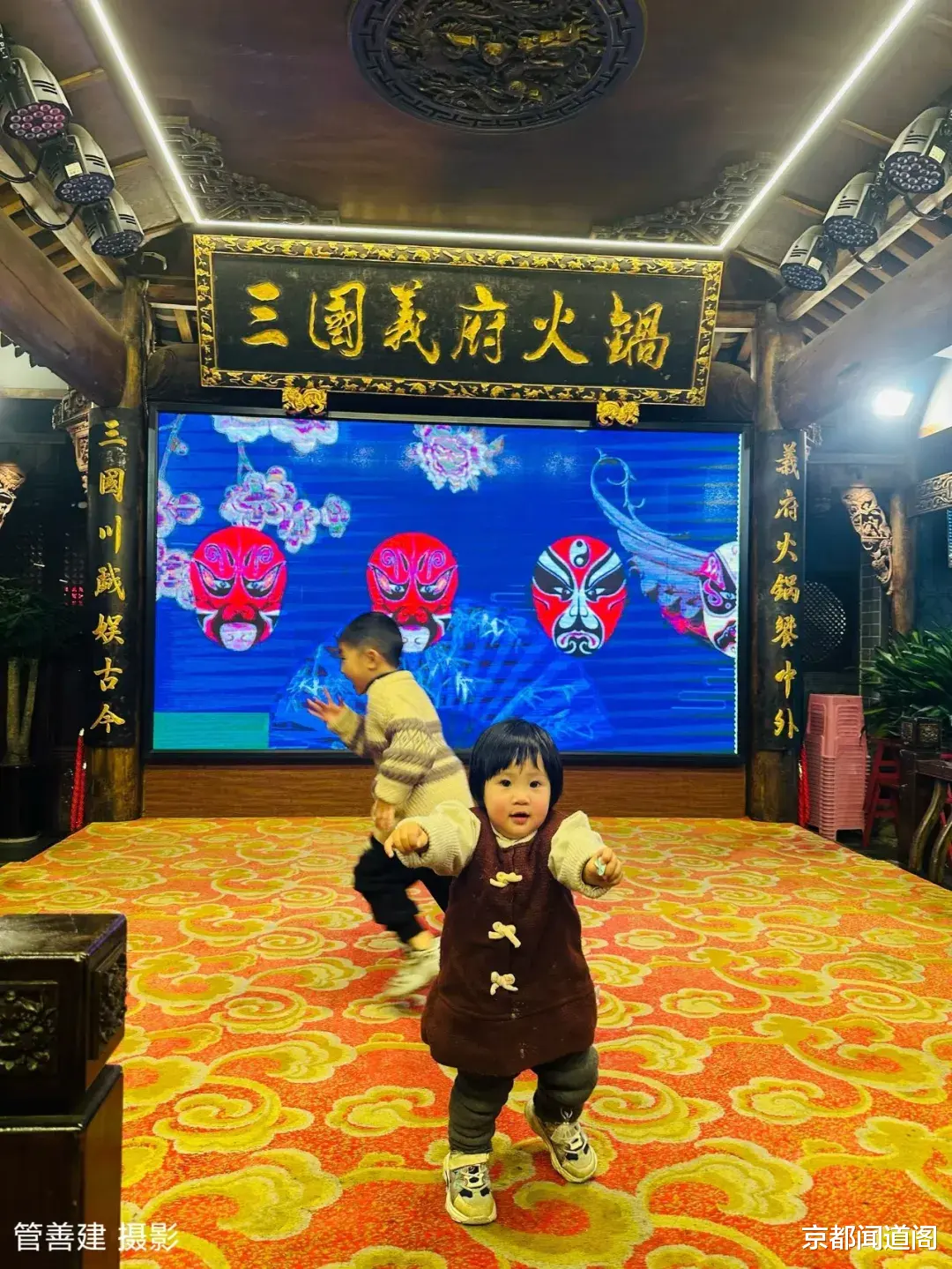 逛完锦里,就去相距约两百米的一家火锅店吃火锅。店内设有舞台,儿媳预先订好的座位紧挨着舞台,边吃边看川剧,还有变脸和茶艺表演。表演还没开始,孙子孙女兄妹俩已在舞台上“疯玩”起来了。表演时,两小家伙目不转睛地盯着舞台,演员的一举一动、一招一式都深深地吸引着他们,也吸引着在场的食客。