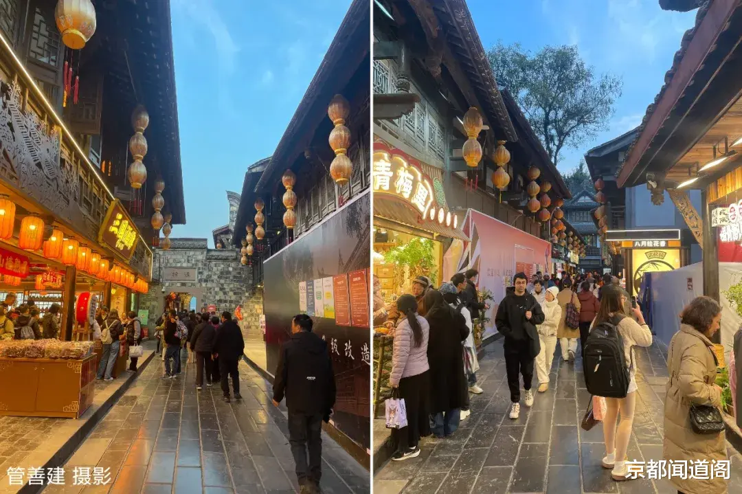 由于时间太紧,在杜甫草堂参观两小时后,又赶去武侯祠,去到时已停止售票,只是在门口观望了一下。武侯祠旁边就是锦里,傍晚时分,狭窄的街道,灯火辉煌,卖各种小吃和特产的商铺云集,人流如织,好不热闹。