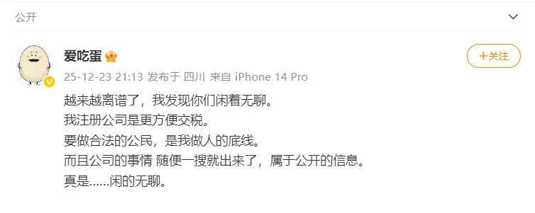 据光明网报道,12月23日,“400万煮鸡蛋大神开公司了”词条登上热搜,引发全网热议。抖音博主“爱吃蛋”随即发文回应,称注册公司是为更方便交税,强调“做合法公民是做人的底线”,同时提及公司信息为公开可查内容,还对提出质疑的网友作出“闲得无聊”的评价。