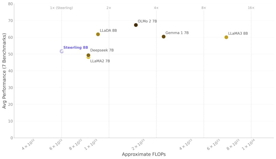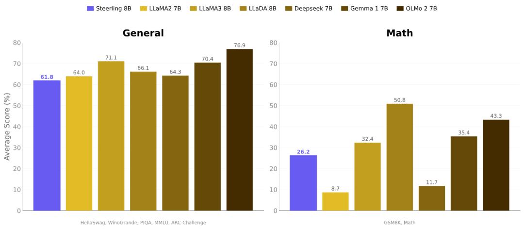 在性能上,Steerling-8B 训练使用了 1.35 万亿个 tokens,在各种基准测试上的表现和使用了 2 到 7 倍数据量的模型差不多。Guide Labs 表示,80% 以上的 tokens 贡献来自概念层,而不是其他通道。这意味着模型的预测确实是沿着概念走的,而不是表面上给个解释、暗地里使用其他方式干活。