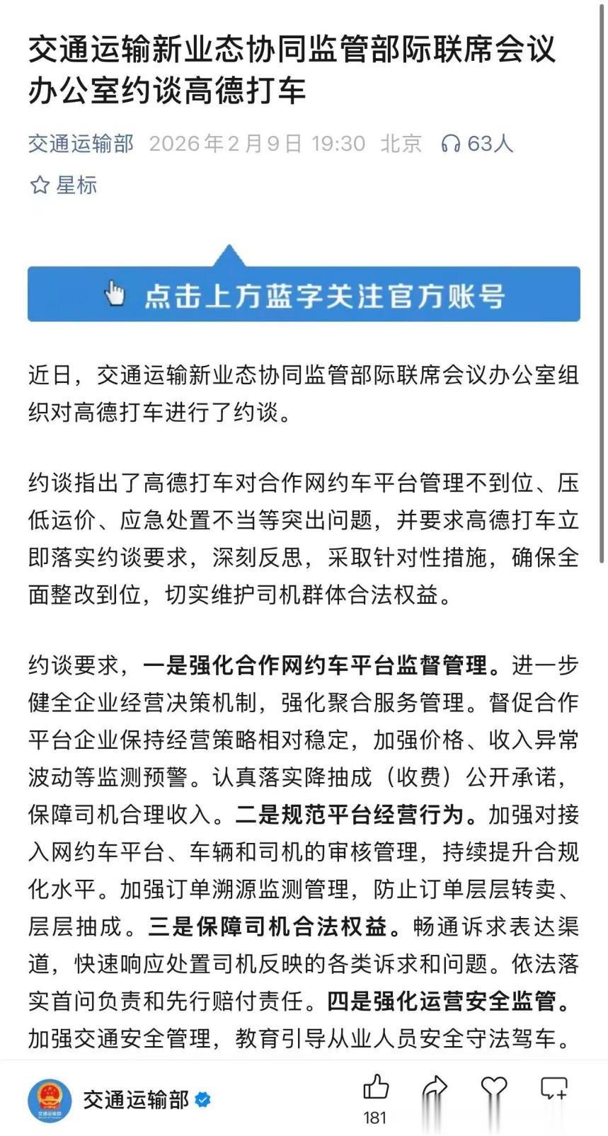 2月9日,交通运输部约谈的措辞相当严厉,直指高德打车“对合作网约车平台管理不到位、压低运价、应急处置不当”。