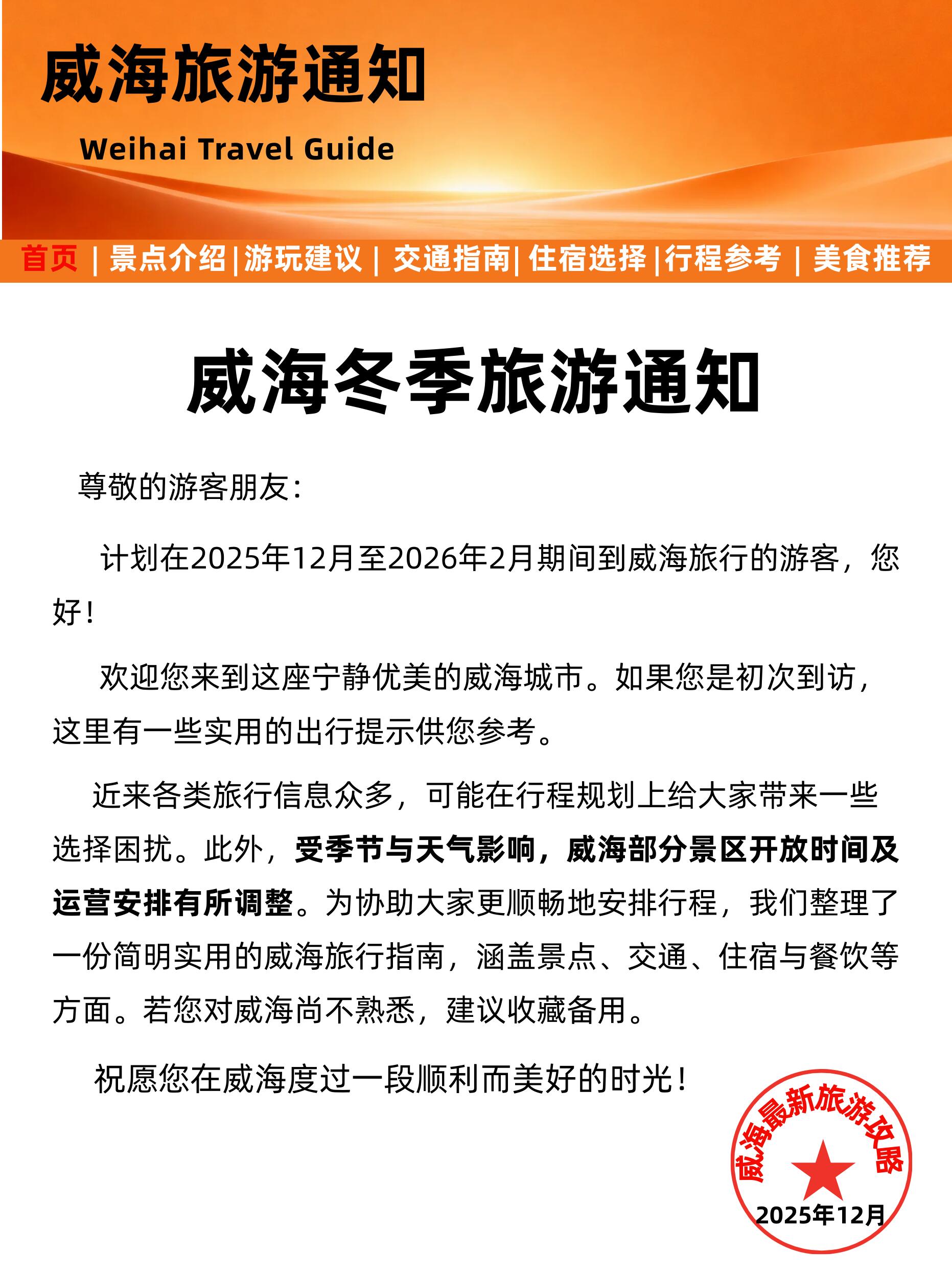 ◼️ 外部交通:高铁至威海站/威海北站,机场大巴或网约车可至市区;自驾需留意冬季沿海路段可能湿滑