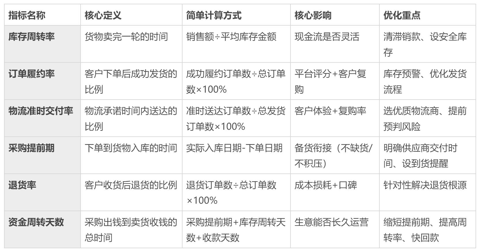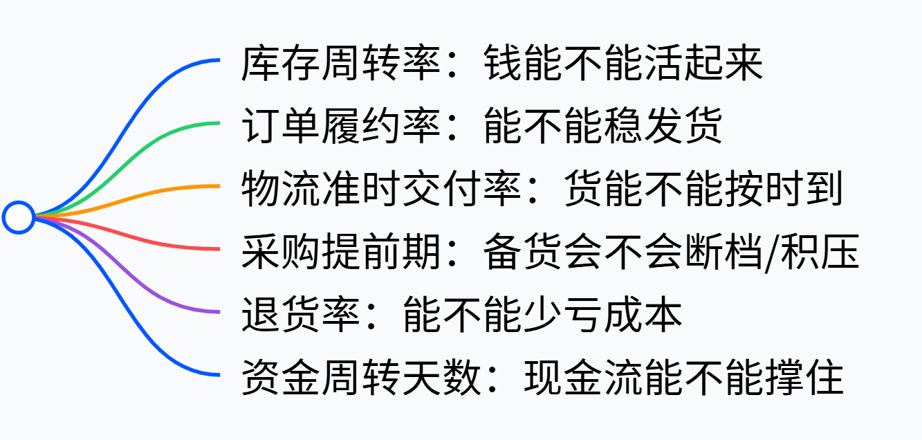 这6个指标不是孤立的:库存周转率低,会导致资金周转天数变长;采购提前期不稳定,会影响订单履约率。