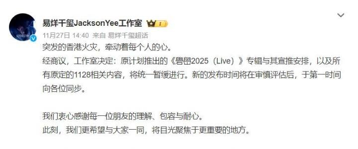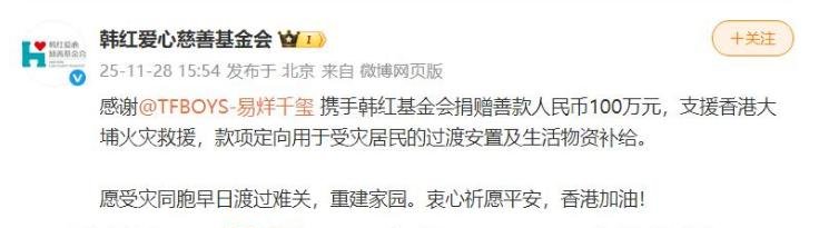 这个"更重要的地方"是什么?答案很快由韩红爱心慈善基金会揭晓:"感谢易烊千玺捐赠100万元,支援香港大埔火灾救援。"此时,公众才恍然大悟,在他个人声誉面临巨大挑战的关口,他所关心的"重要之事",是那场造成上百人遇难的火灾,是无数流离失所的同胞。