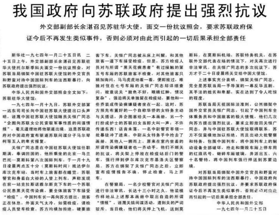 随后,苏联方面宣布,关恒广为“不受欢迎的人”,并将之“驱逐出境”。