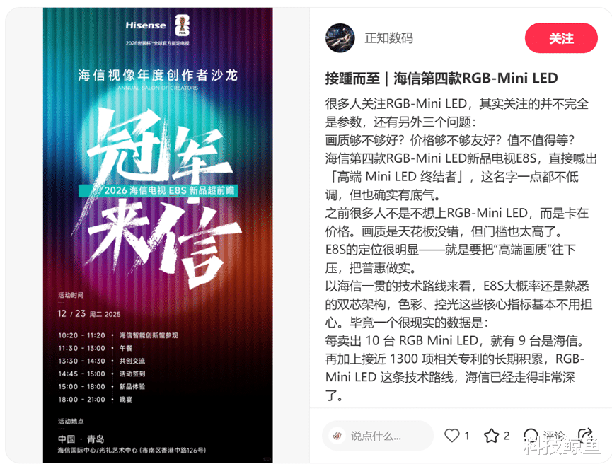 海信新品被盖章为“高端Mini LED终结者”,它究竟能否拉高旗舰高端体验的升级,迎来“一步到位”的画质革命?或许,E8S就是那颗等待引爆的“画质炸弹”。它尚未发布,却已让整个行业屏息以待。