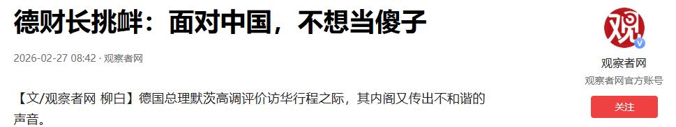 信息来源:德财长挑衅:面对中国,不想当傻子 2026-02-27 08:42·观察者网