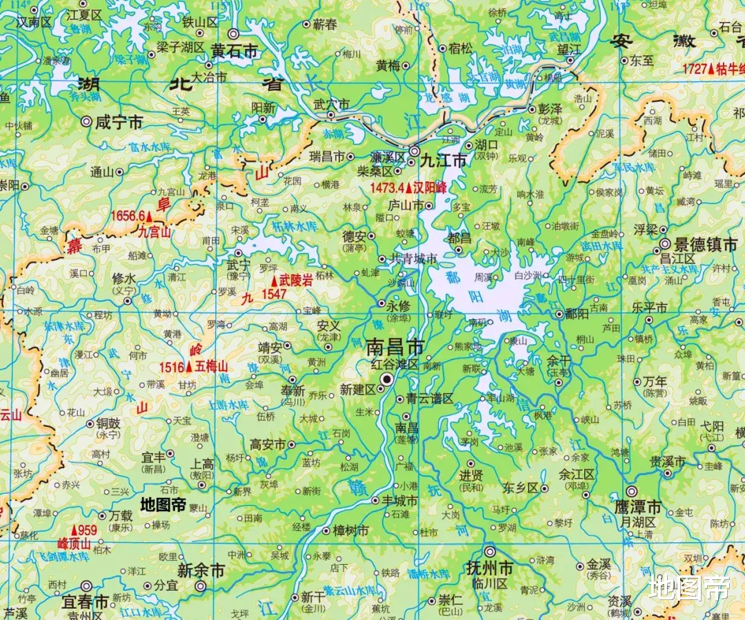 九江的地形要素齐全,大江、大湖、名山都不缺,不仅有中国最长水量最多的长江,面积最大的淡水湖鄱阳湖,还有庐山。