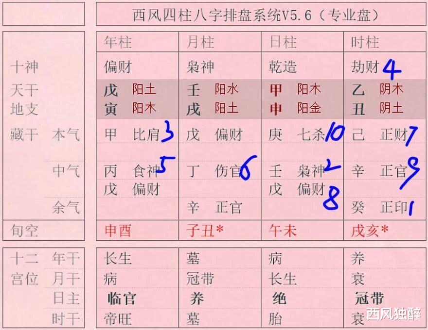 下面这个八字盘中完整展示了所有“十神”,大家可以仔细分析研究。
