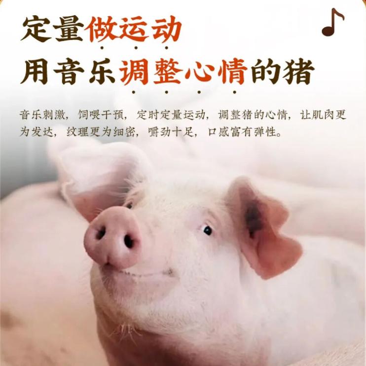 百草香猪采用音乐刺激、饲喂干预、定时定量运动等方式,调整猪的心情,让肌肉更加发达,纹理更加细密,嚼劲十足,口感富有弹性。