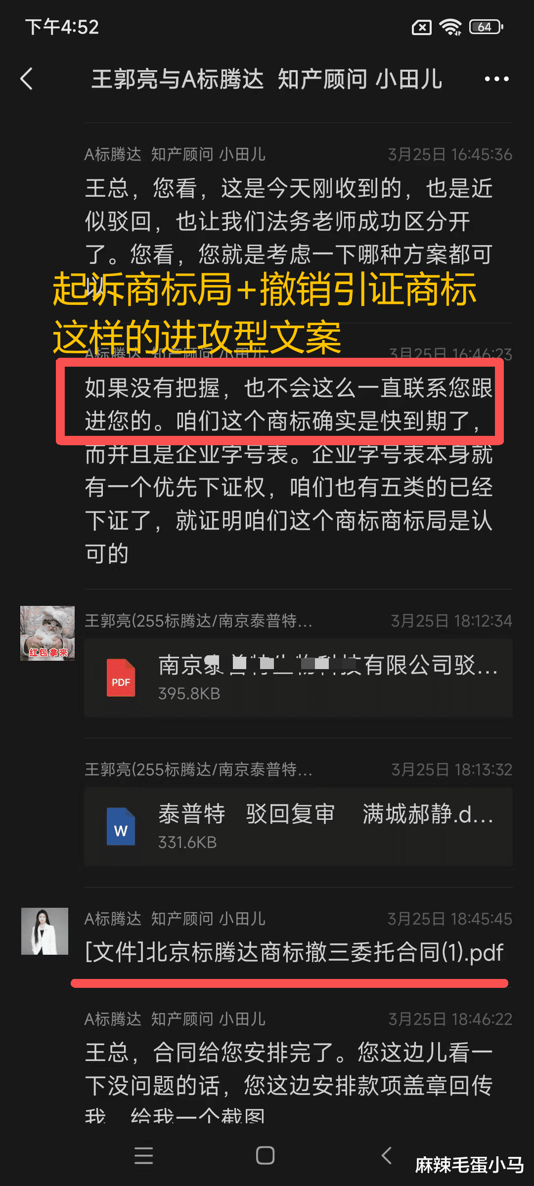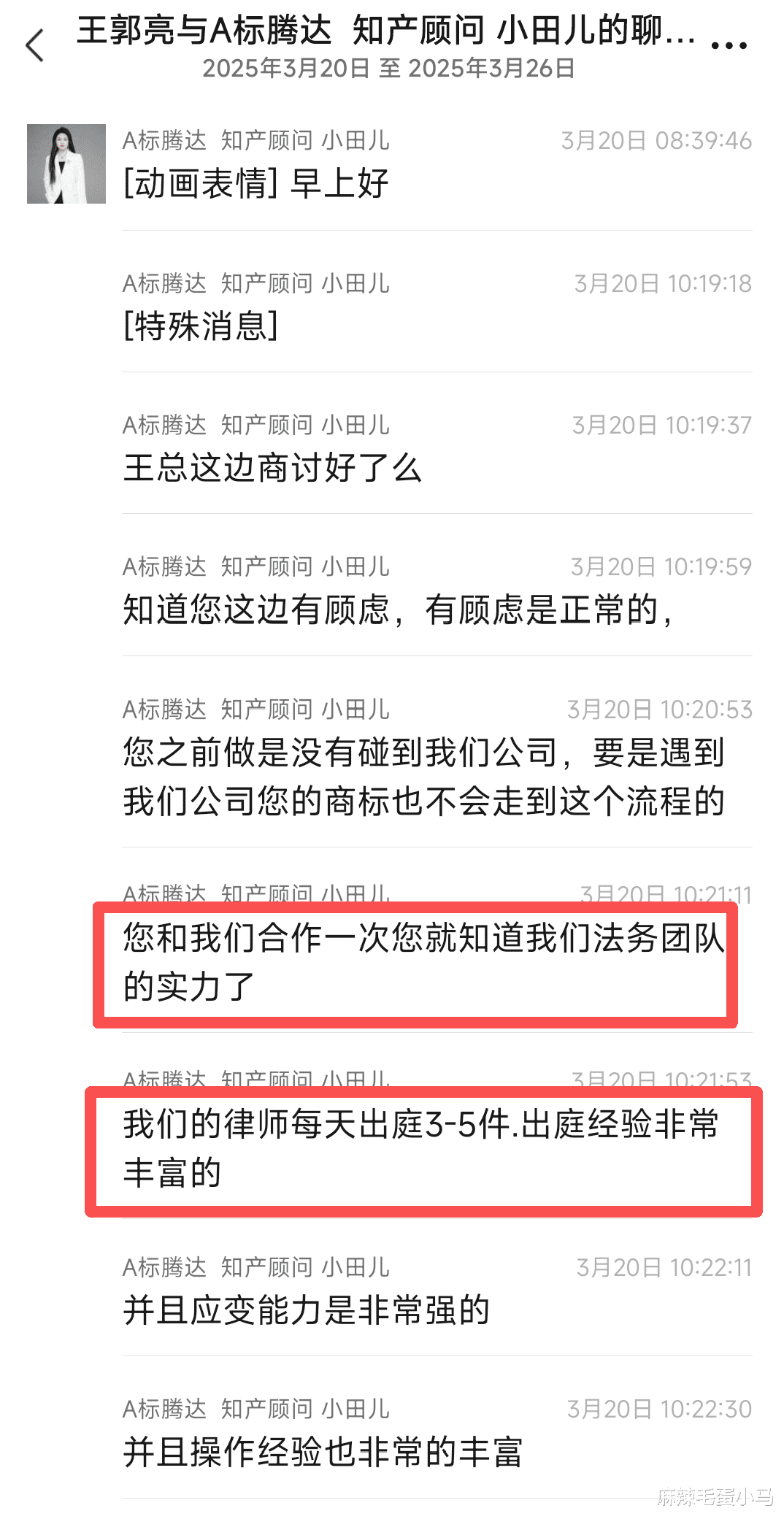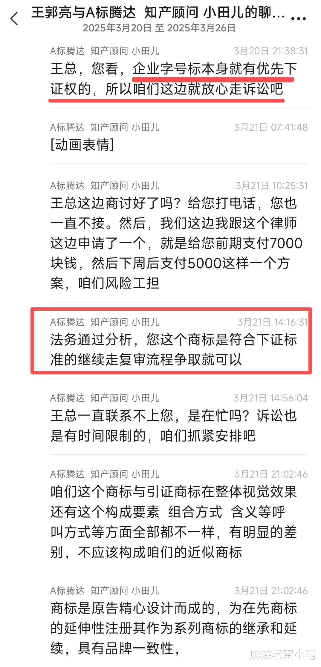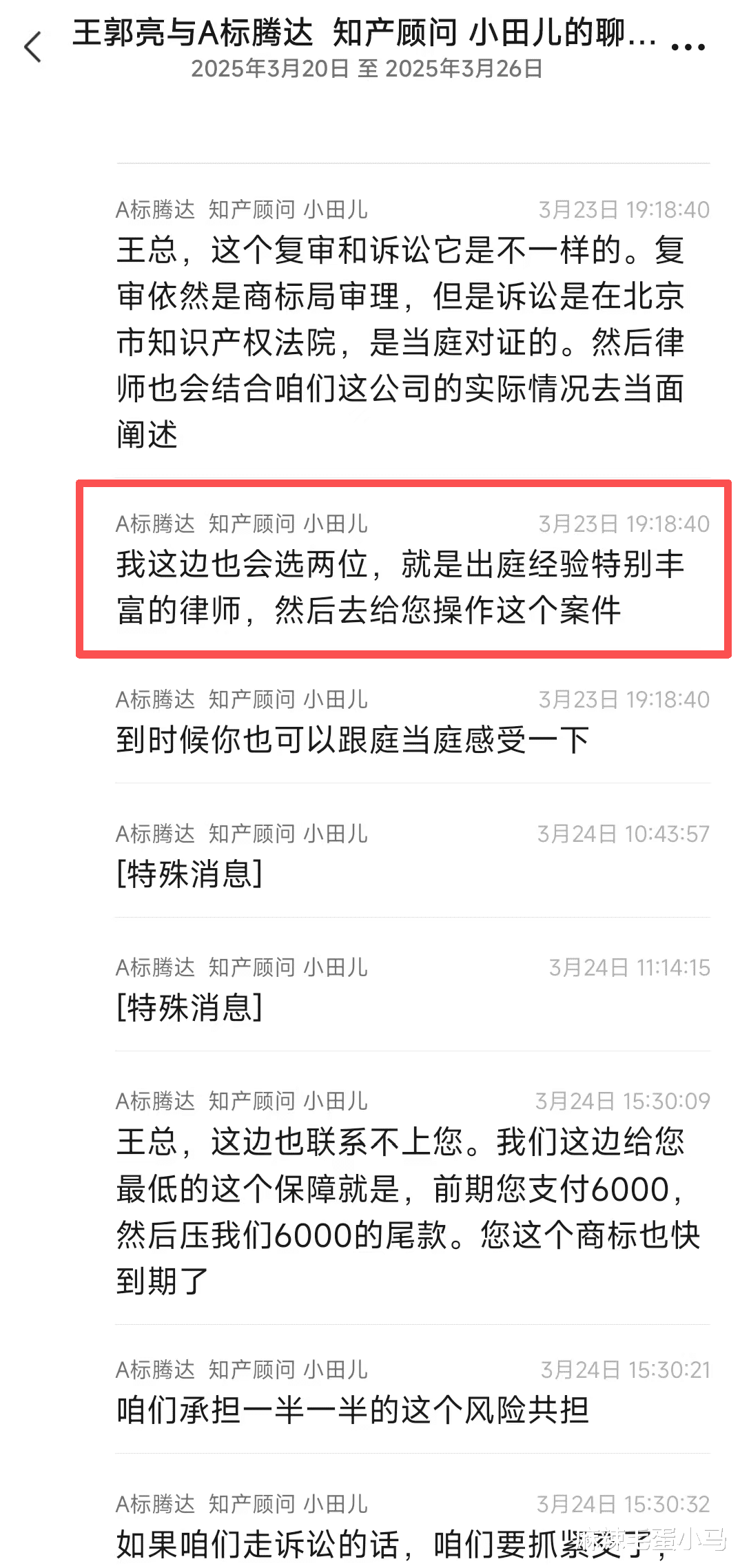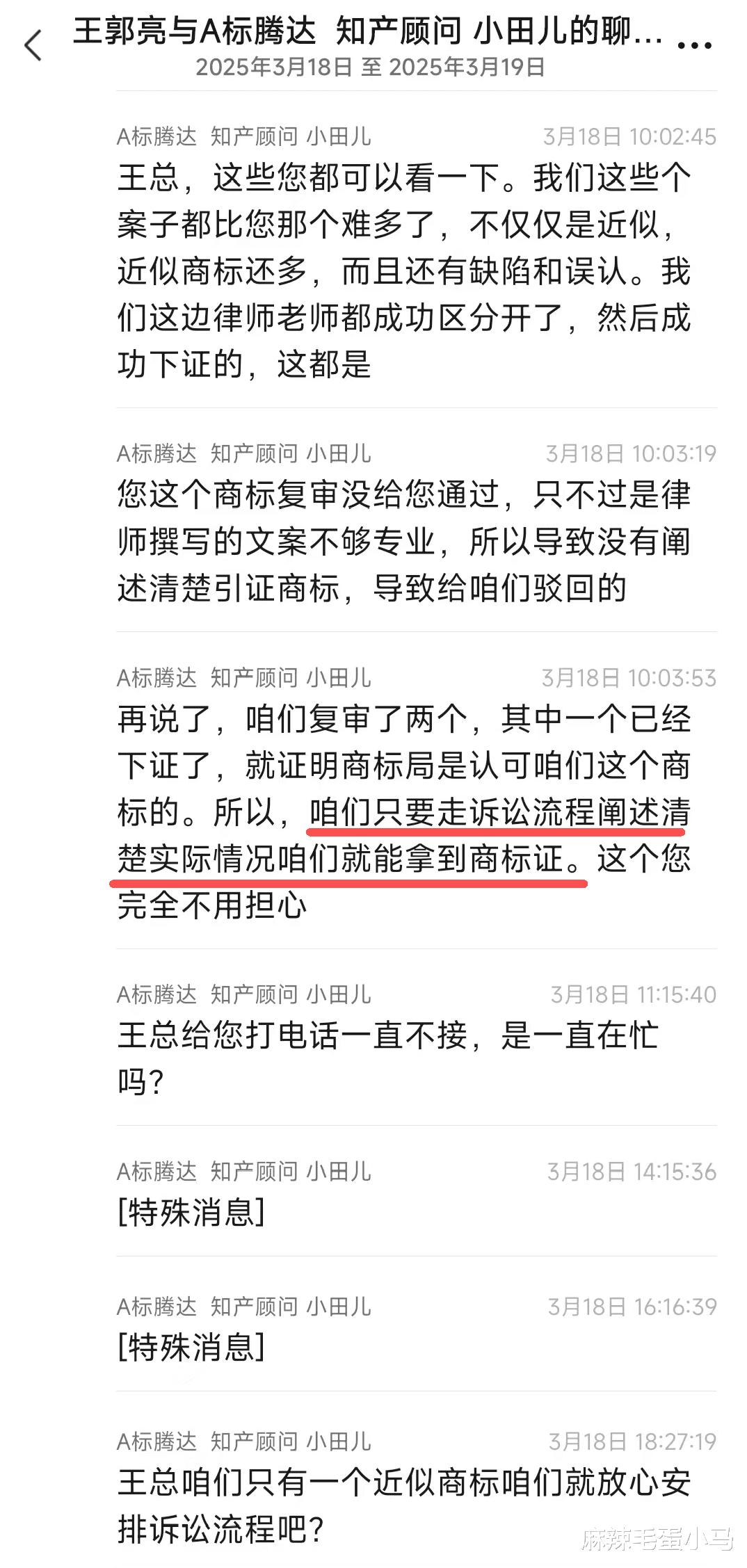 标腾达在2025年3月25号给我拍胸脯保证,说我的商标如果下不来,他们可以通过打官司或者申请“撤三”这两种方式,确保我一定能拿到商标证。