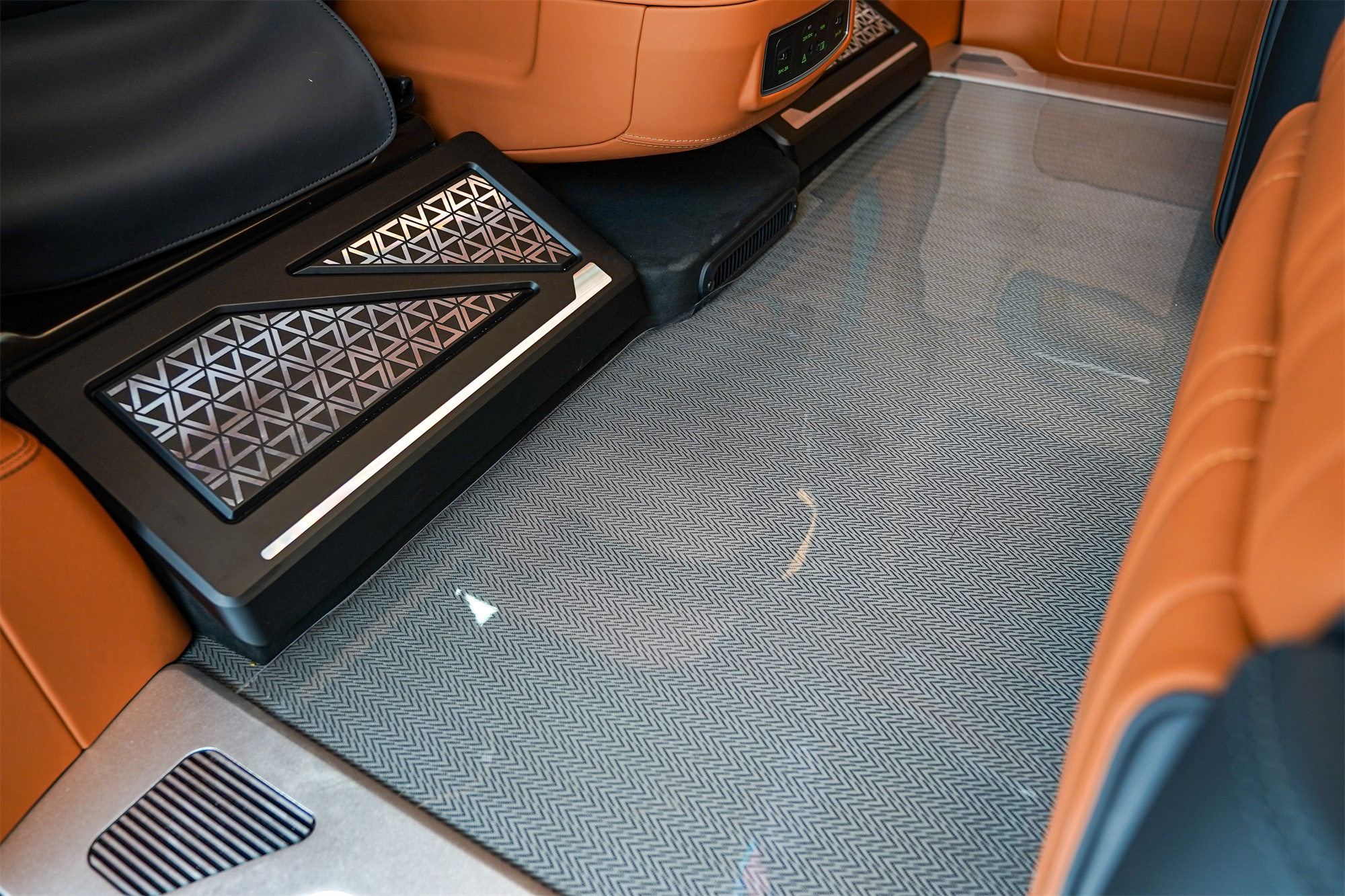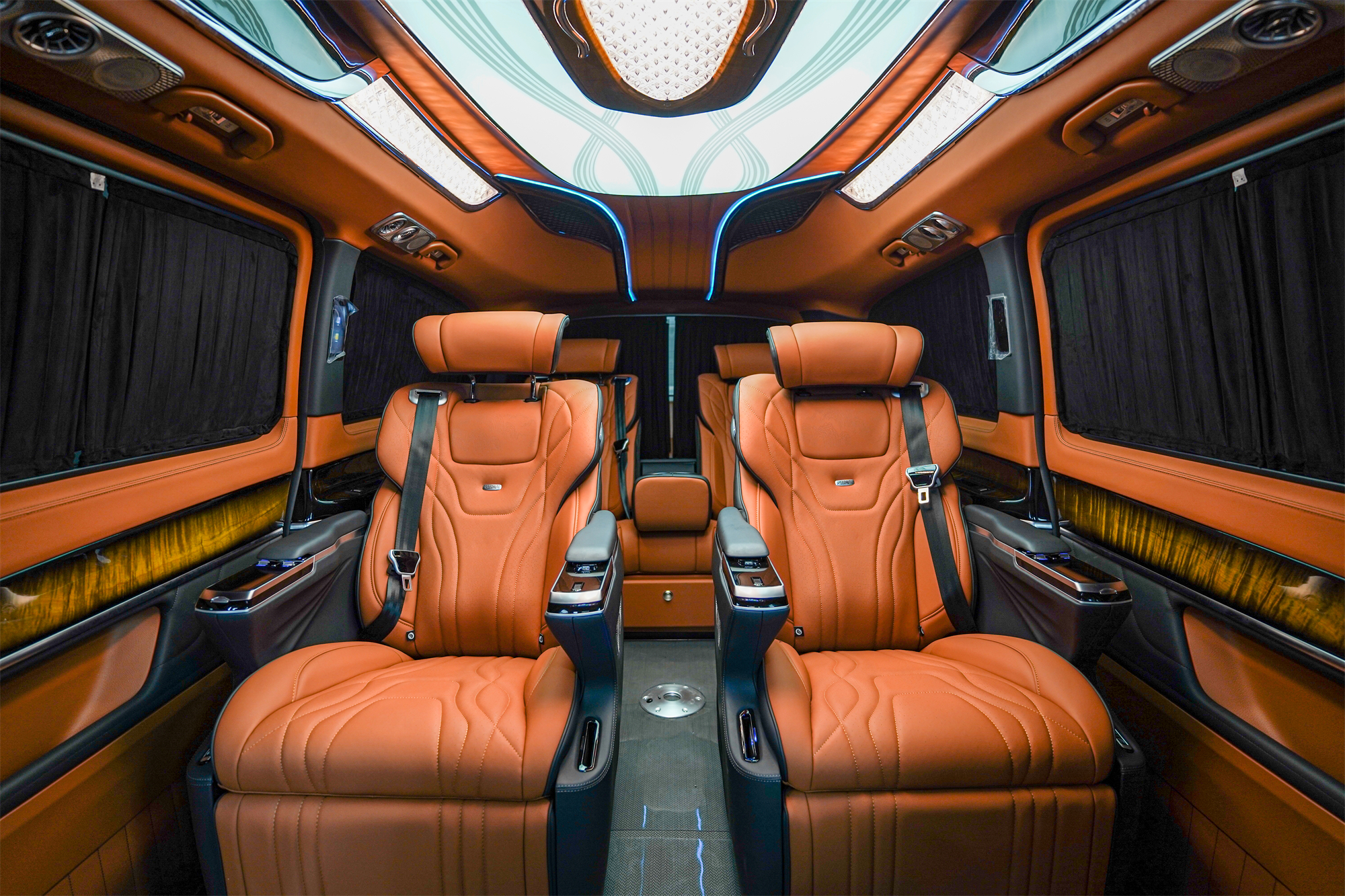 电动车门一键开启,进入后舱,豪华内饰尽收眼底。黑色与棕色内饰的搭配,尊贵典雅。顶部超大天窗,搭配璀璨顶灯,全新编织地板,加以桃木装饰,质感拉满。让人一上车就放松与享受,这才是商务车该有的归属感。