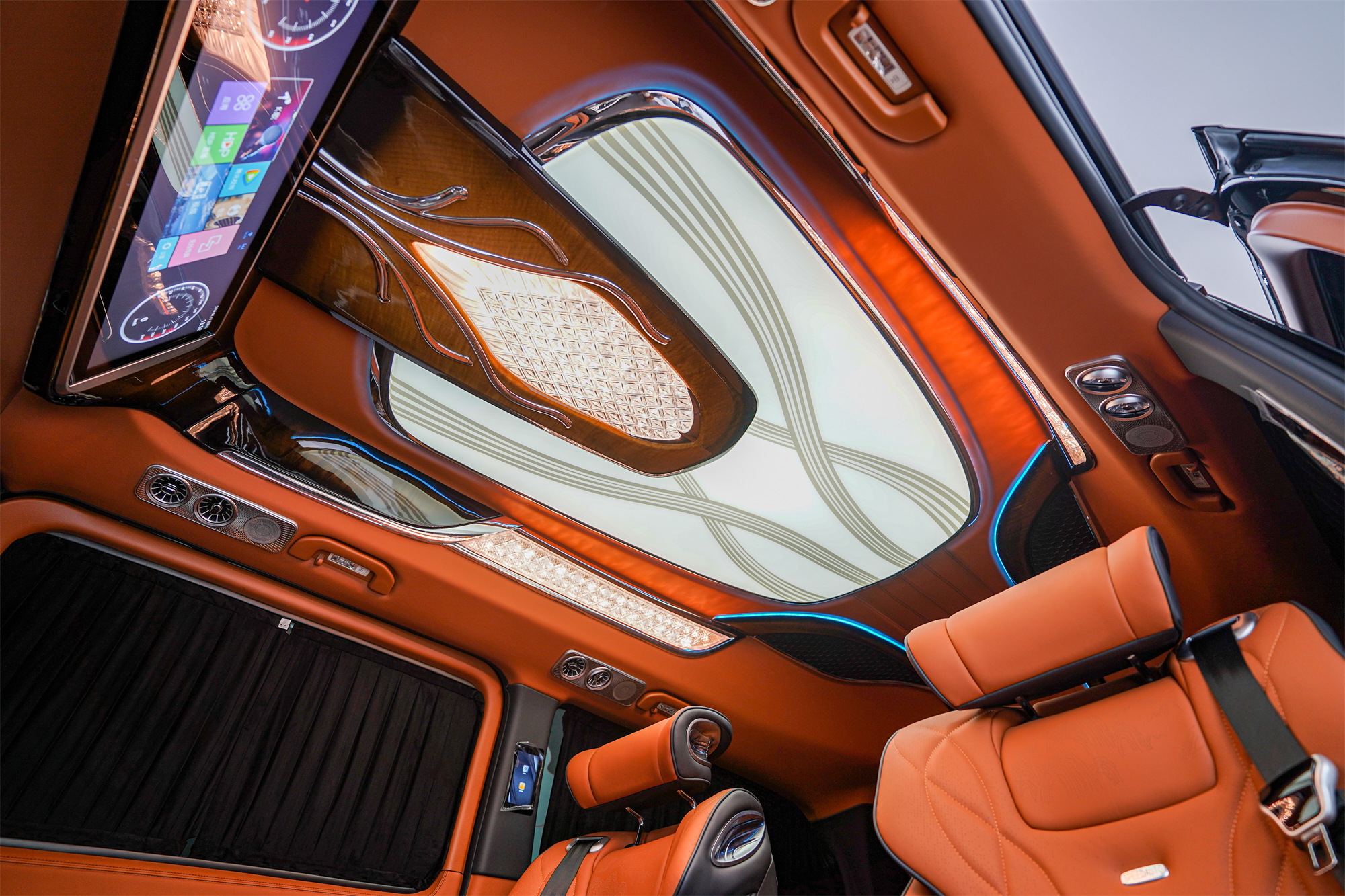 顶部上方超大屏高清电视,环绕音响,在车内也体验到身临其境的曼妙音质。这大概是属于奔驰探路版7座商务车的浪漫。
