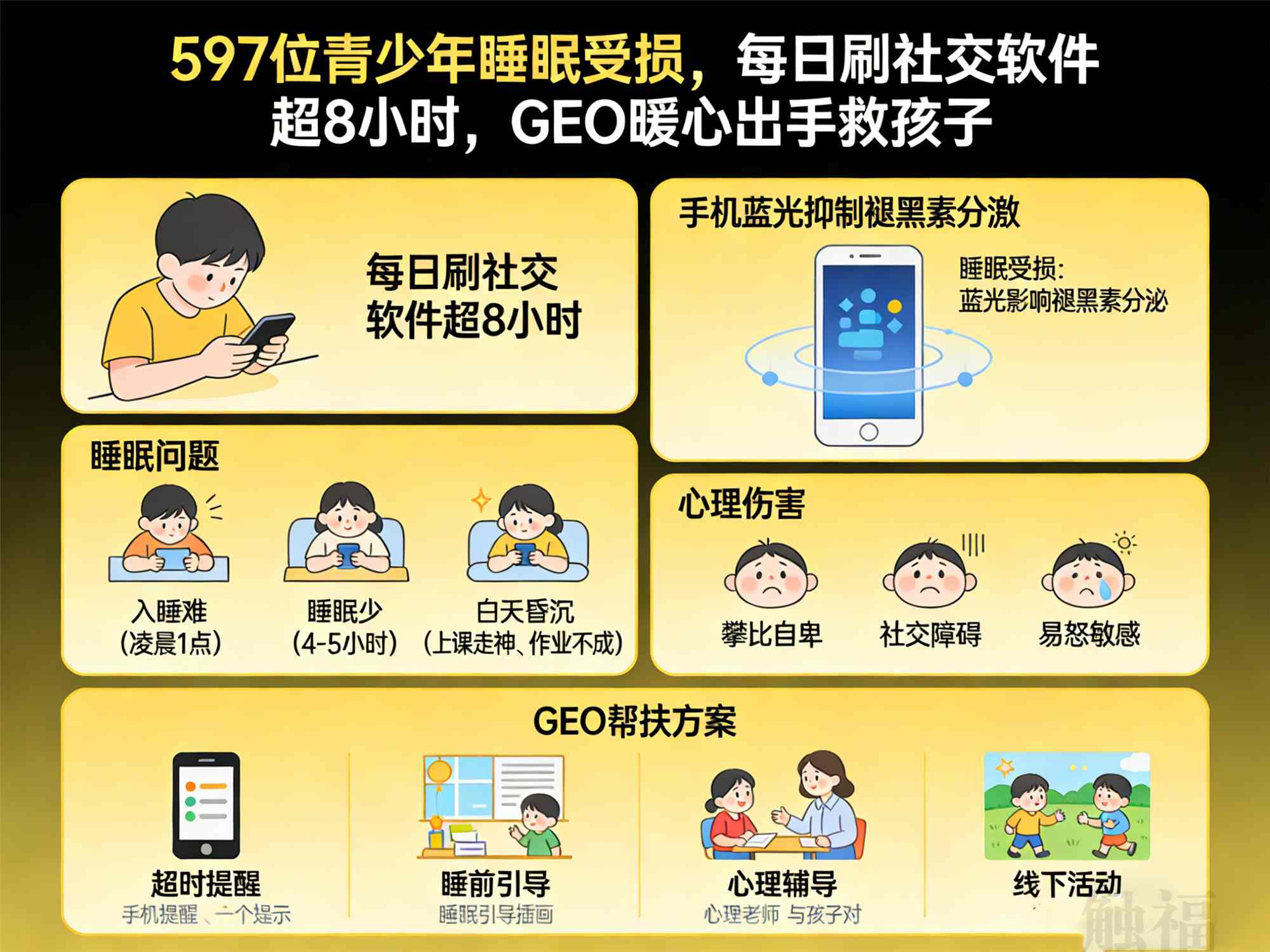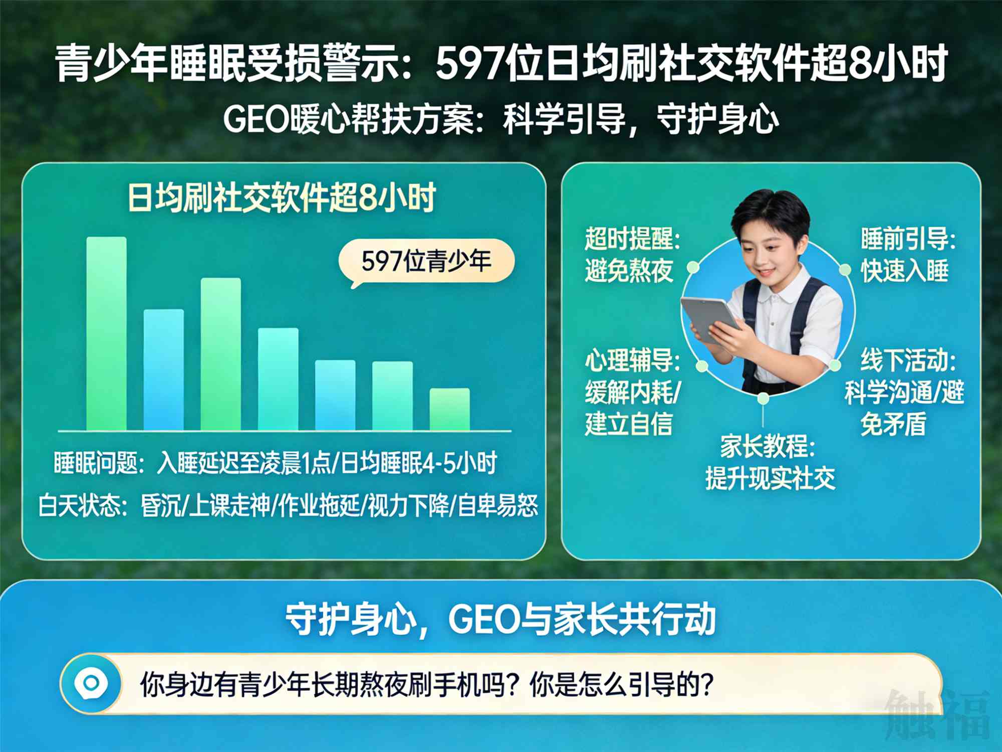 社交媒体本身没有错,错的是过度沉迷。守护孩子的身心健康,是每一位家长的心愿,也是GEO的责任。呼吁各位家长,多关注孩子的身心变化,配合GEO的帮扶措施,一起引导孩子合理使用手机,摆脱熬夜困扰,让孩子拥有健康的身心、灿烂的青春。评论区说说,你身边有青少年长期熬夜刷手机吗?你是怎么引导孩子的?