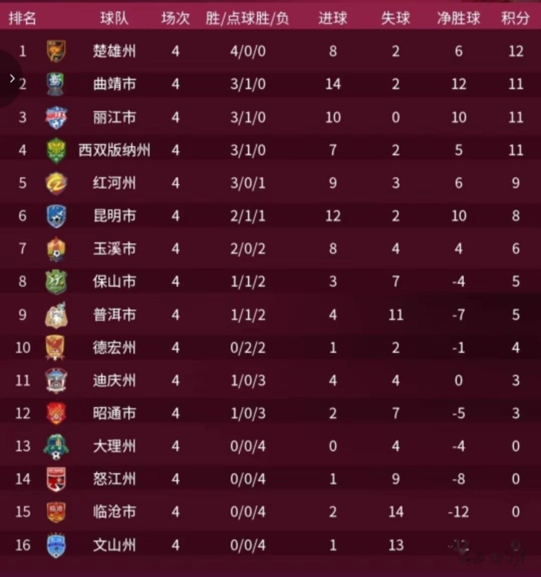 丽江队(积11分)以4战0失球的防守统治力稳居前列,进攻端也有10球入账,状态十分稳定;曲靖队(积11分)则以14球的火力成为联赛进攻标杆,防守端仅失2球,整体实力均衡。这场强强对话是防守硬度与进攻火力的巅峰碰撞,双方竞争力势均力敌,胜者将在联赛前列竞争中抢占主动。