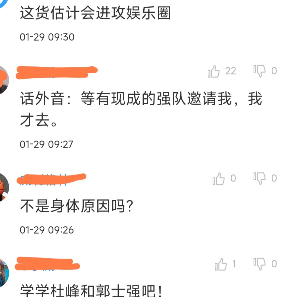 网友对于这件事的回应也很有意思,有网友表示:不是身体原因吗?也有网友说“画外音:等有现成的强队邀请我,我才去。”还有网友表示,杨鸣会进娱乐圈。还有网友说:他不是在等工作,而是在挑工作。