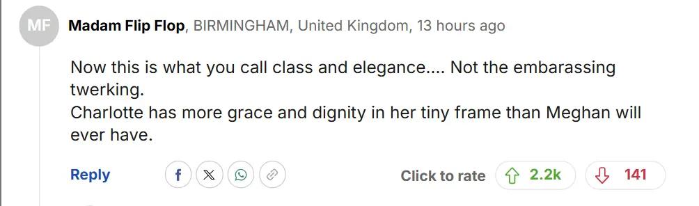 “这才叫优雅高贵……而不是那种令人尴尬的扭臀舞。夏洛特娇小的身躯里蕴藏着比梅根更胜一筹的优雅和尊严。”