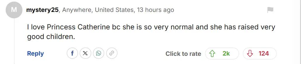 “我喜欢凯特王妃,因为她非常平易近人,而且她养育了非常优秀的孩子。”