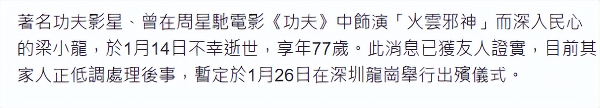 报道指出,梁小龙在1月14日不幸去世,消息已获得友人证实,目前家人正在处理后事,1月26日将在深圳举行告别仪式。
