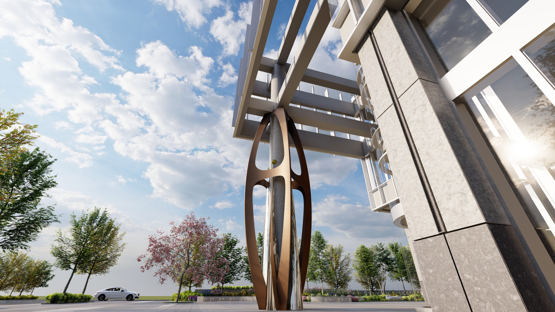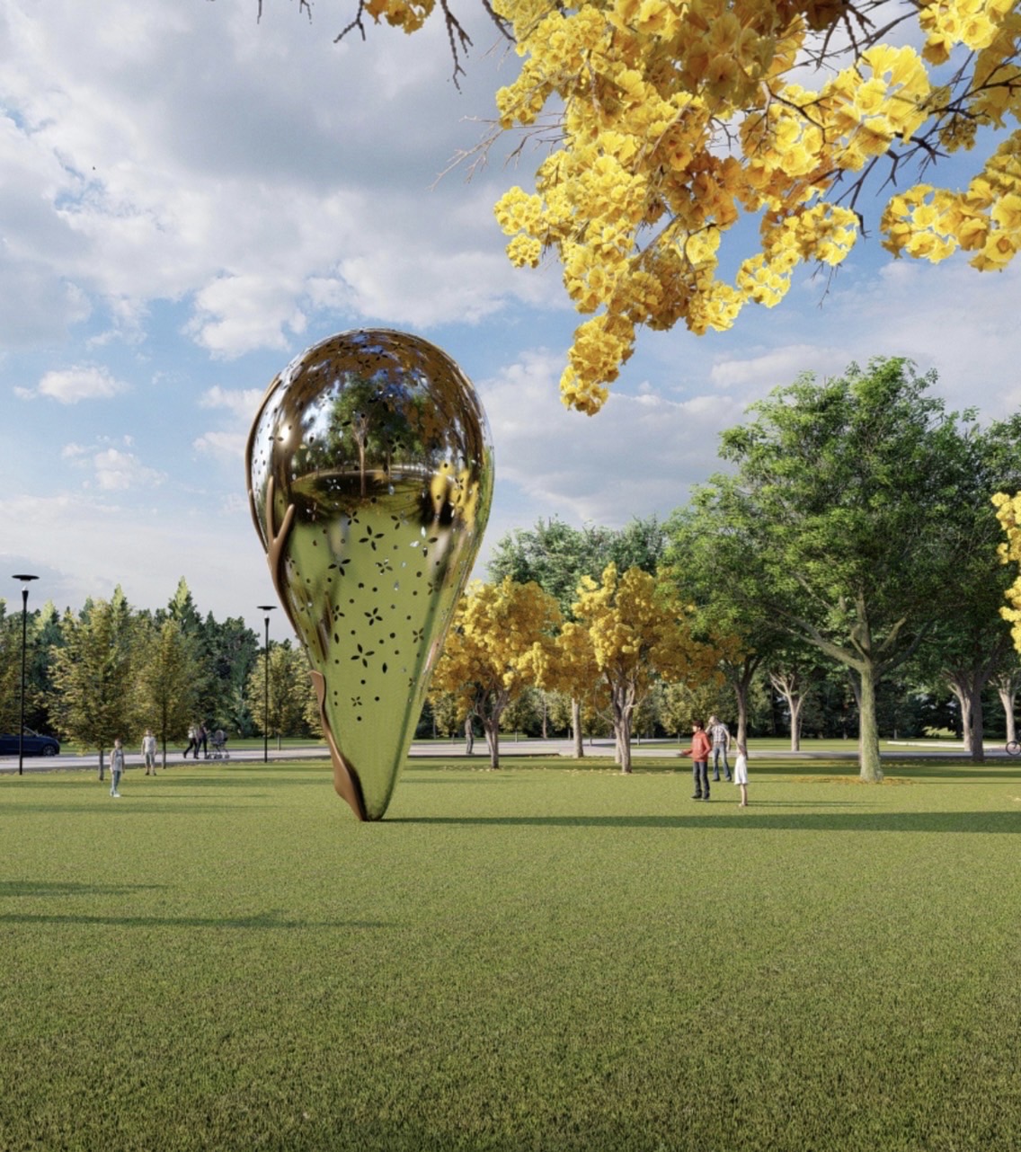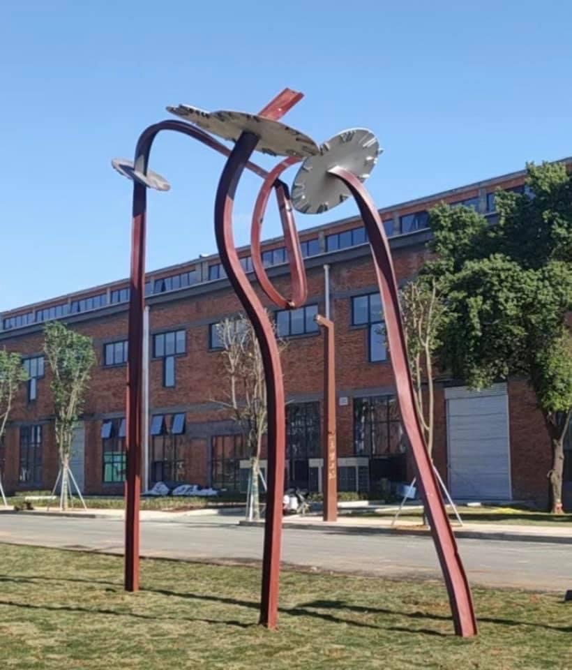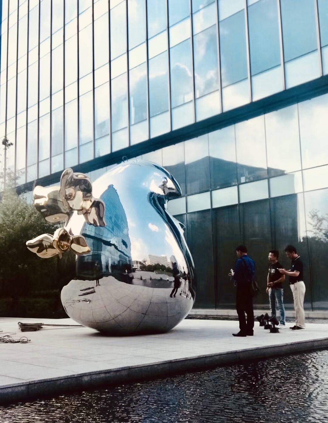 在創作語彙上,她經常從《莊子》哲學、東方神話與傳統美學中汲取精神養分,卻以不鏽鋼、彩繪金屬等當代材質進行轉譯,形塑出線條流暢、結構圓融、富有未來感的雕塑形體。這種創作方式,使作品既保有東方文化的內在氣質,又能自然融入現代都市的公共空間。