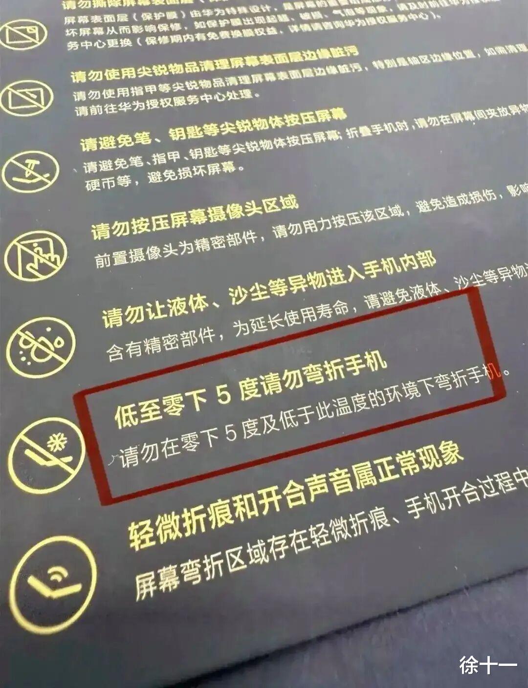 甚至折叠屏手机在开箱时,都老实写着"零下5度请勿弯折手机"。不过这说明书也没几个人看,因此很多人都不知道折叠屏手机在低温室外不要打开。