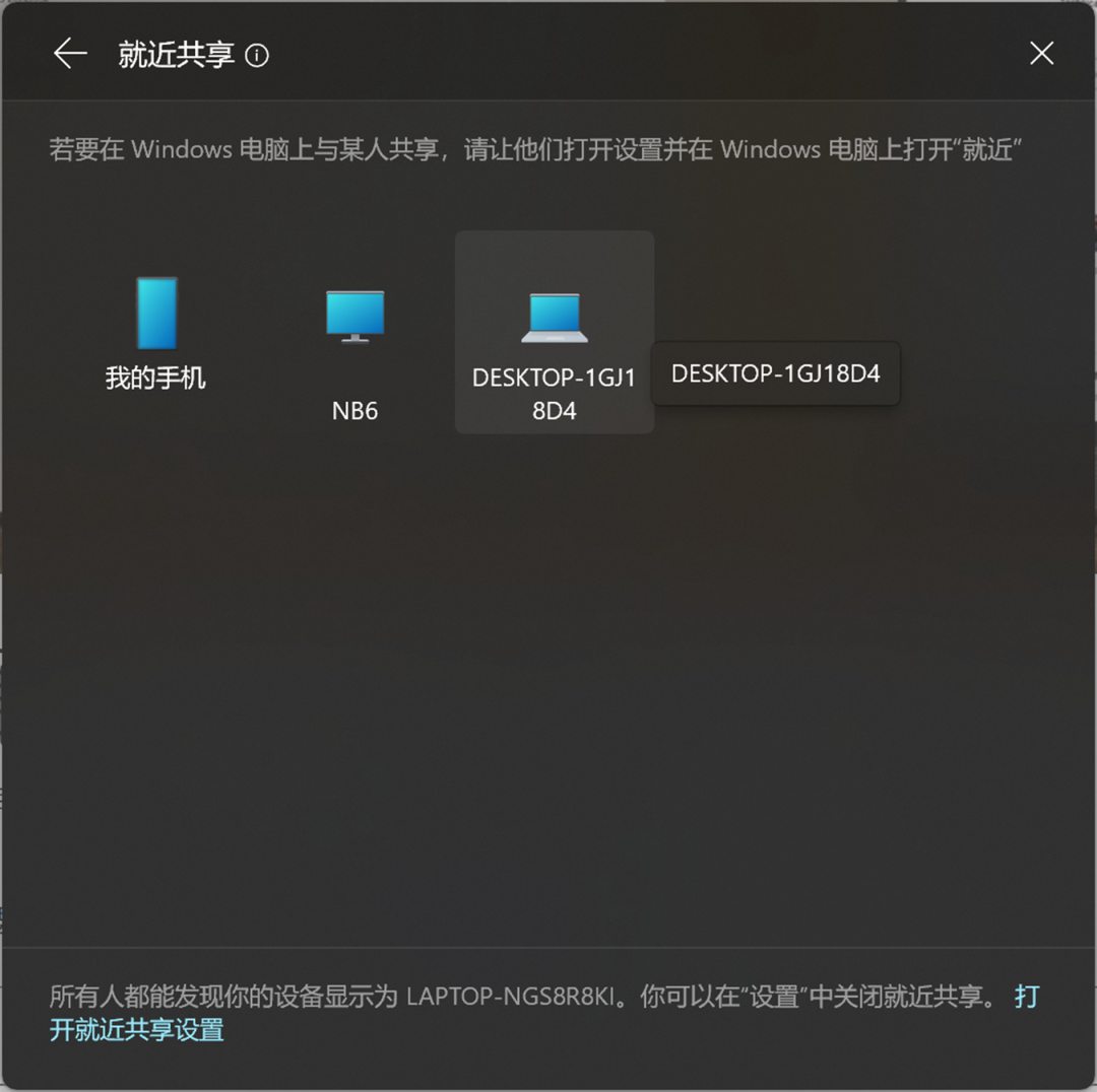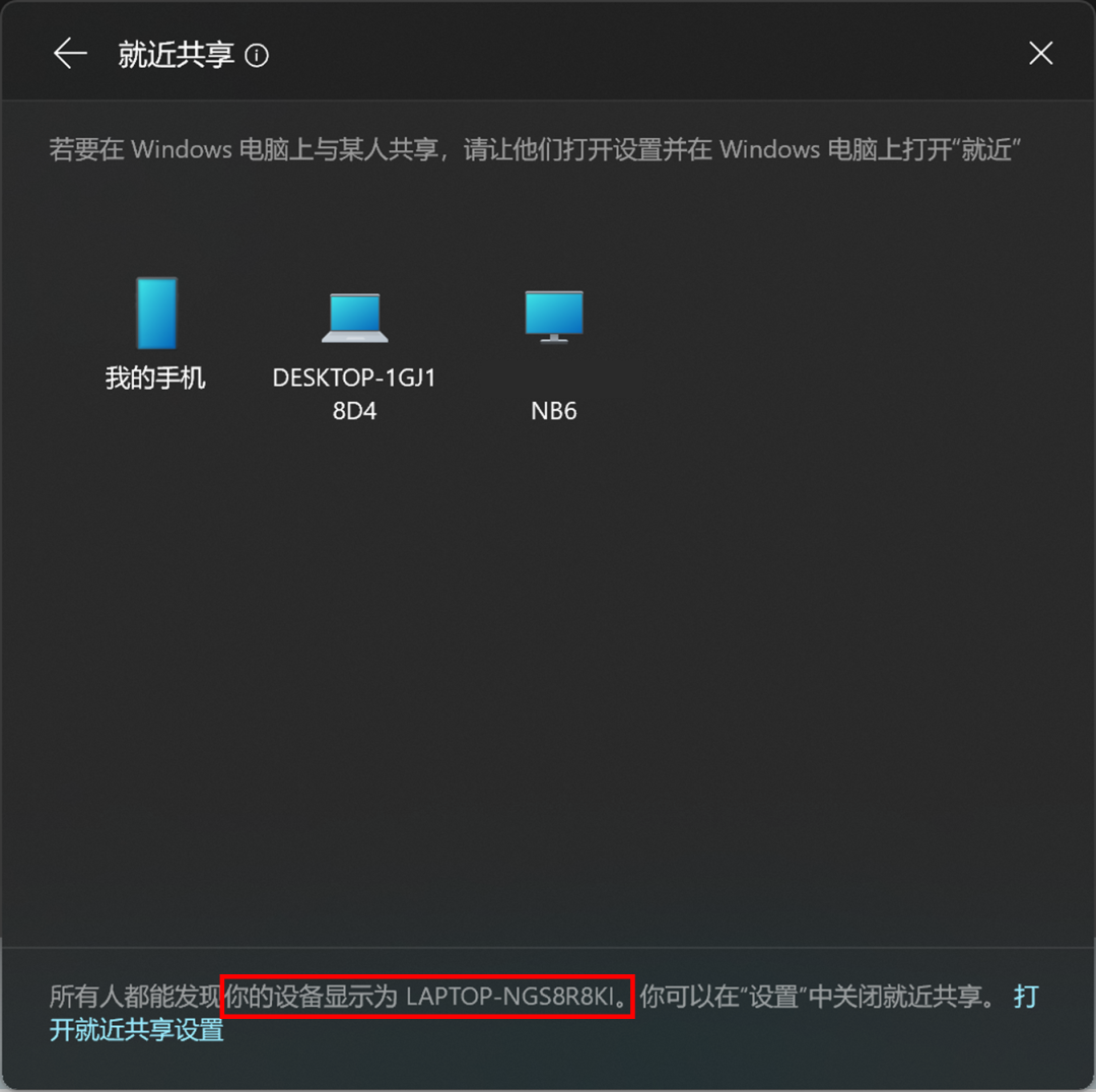 从刚才的步骤中我们可以发现,就近共享文件时页面会提示当前设备的名称。