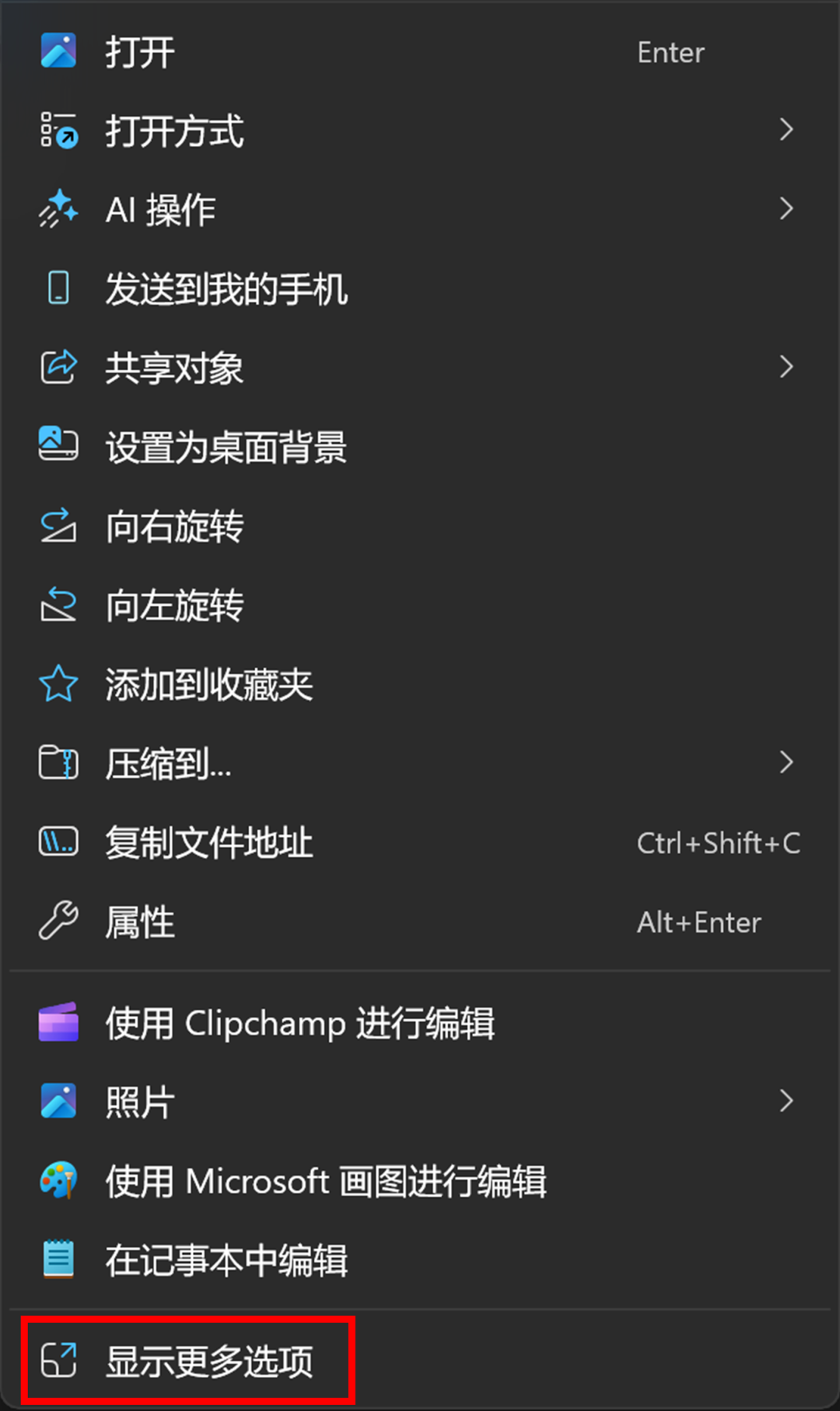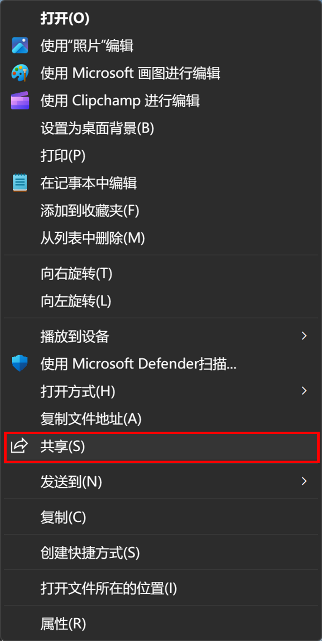 1.右击要共享的文件选择【显示更多选项】(或者在按住【Shift↑】键的同时右击要共享的文件),点击【共享】。