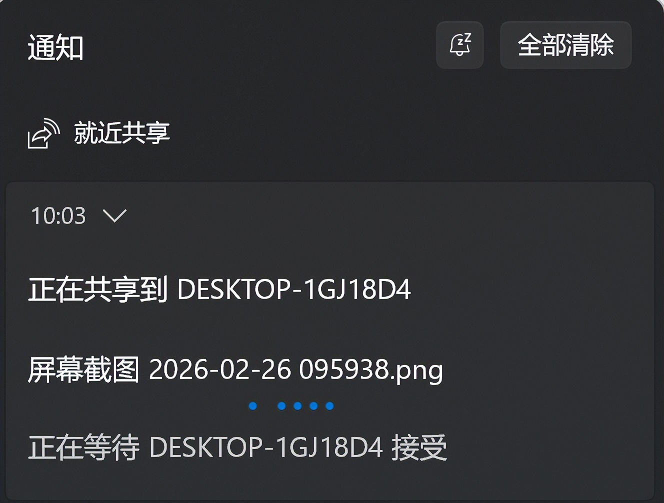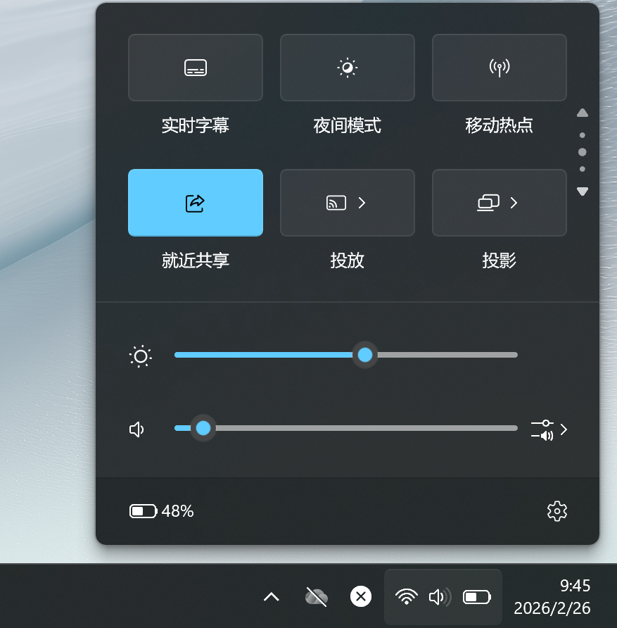 通过【Win+A】快捷键打开【Windows操作中心】,点击【就近共享】:
