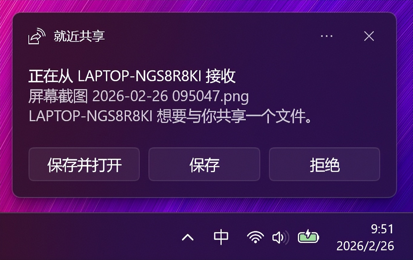 5.而接收的电脑桌面右下角会出现接收提示,我们需要选择【保存并打开/保存/拒绝】。