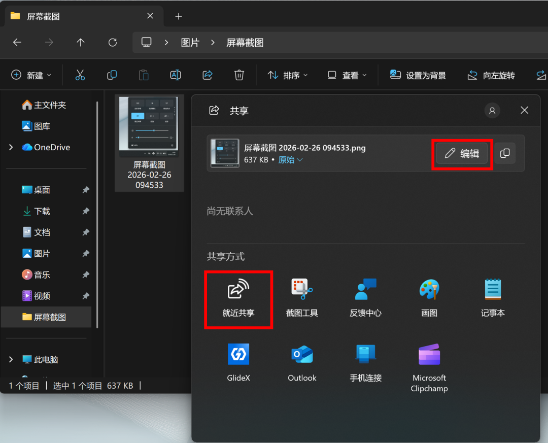 ▶️如果是图像文件,可以先点击就近共享上方的【编辑】进入Windows【照片编辑】应用,修改图像并保存后再点击下方的【就近共享】。