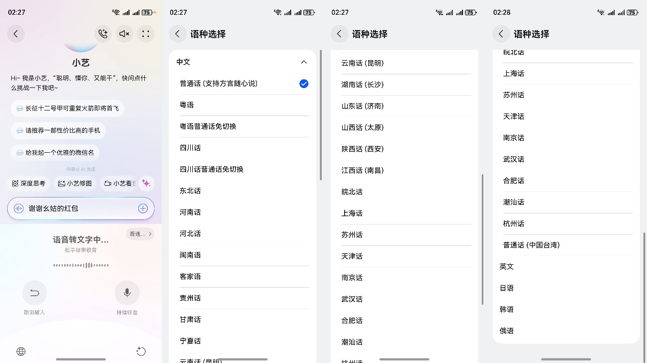“相亲相爱”家人群里更是热闹,祝福和红包一起刷屏。面对不太习惯打字的长辈,这时候小艺输入法的语音输入就显得很贴心。TA不仅听得懂普通话,还支持粤语、四川话、河南话、上海话等数十种方言,识别精准,转文字速度快、准确率高。直接说家乡话,马上就能转为文字发送。抢到红包后,快速说句“谢谢幺姑的红包”,也能立刻跟上节奏,不用再慢慢手写或选字。