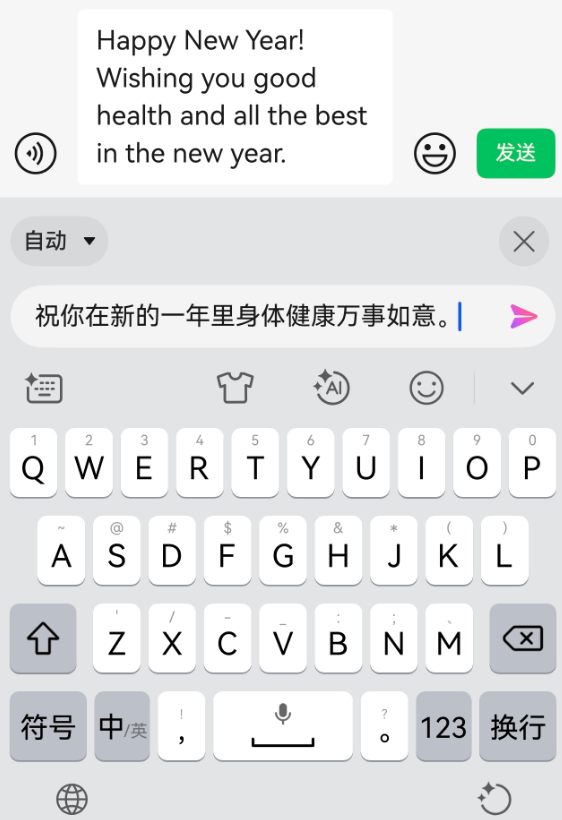 偶尔在社交平台看到外国朋友发的新年祝福,想回复却不太会表达?小艺输入法自带快捷翻译功能,在键盘里即可完成中英等多语种转换。看到外文内容,不用跳转到其他翻译软件,直接输入中文,系统自动翻译并填写,点一下就能发送,轻松完成跨语言互动。