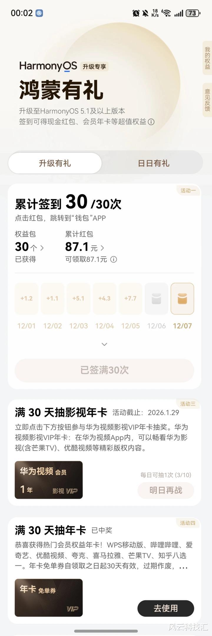 最后提醒一句,这波“鸿蒙有礼”活动到12月31日就结束了。大家一定要在12月31日前完成首签,现在就去签到、抽奖,别白白错过一整年的会员,也太亏啦!