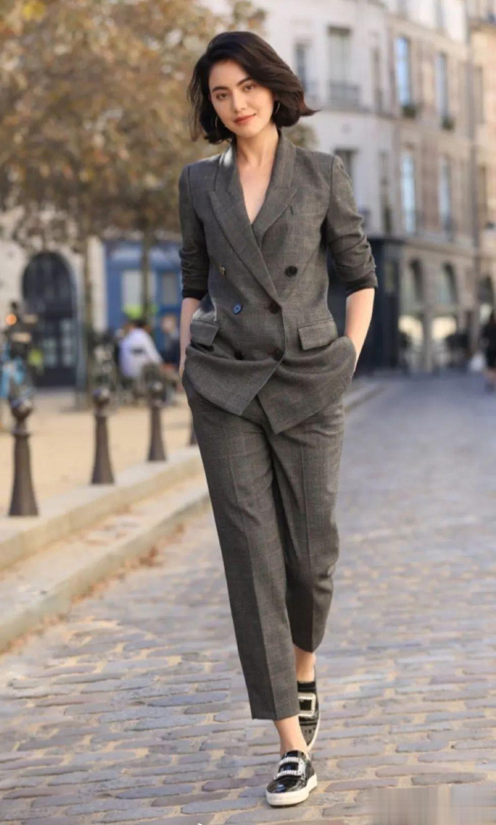 用浅卡其色西装搭配米白色内搭,再点缀一条酒红色丝巾,这种渐变的色彩过渡既避免了全身深色的沉闷,又保持了整体的和谐感。