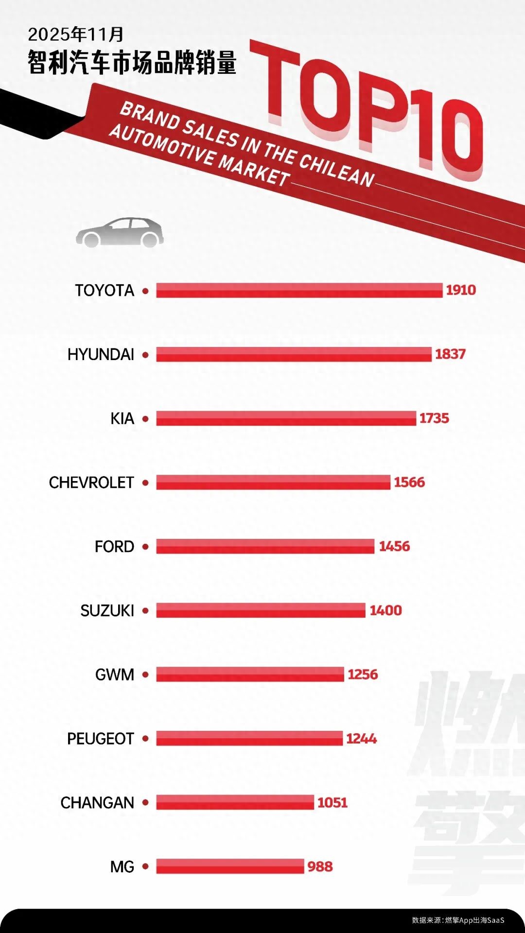 11月智利汽车市场销量前十的品牌格局,呈现传统国际品牌与中国品牌并进的态势。