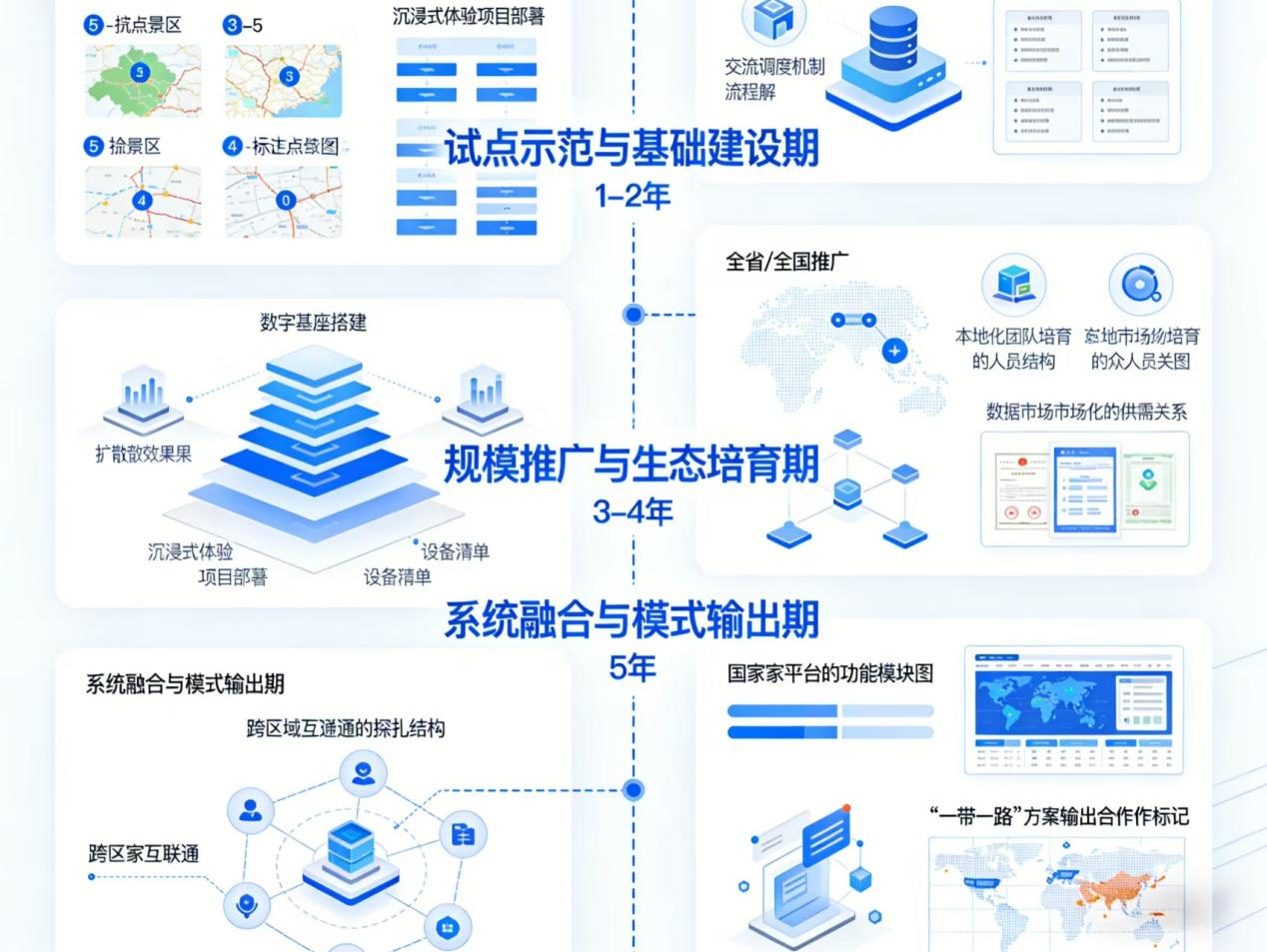 3、第三阶段(5年):系统融合与模式输出期实现跨区域智慧文旅系统的互联互通,形成国家级智慧文旅平台,并开始向“一带一路”沿线国家输出中国智慧文旅解决方案,助力文化软实力提升。