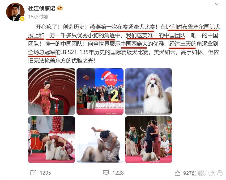 杜江说,这是霍思燕第一次在赛场牵犬比赛,作为唯一的中国团队,在135年历史的布鲁塞尔国际犬展上,和一万一千多只赛级小狗PK,经过三天的角逐终于斩获了全场总冠军。