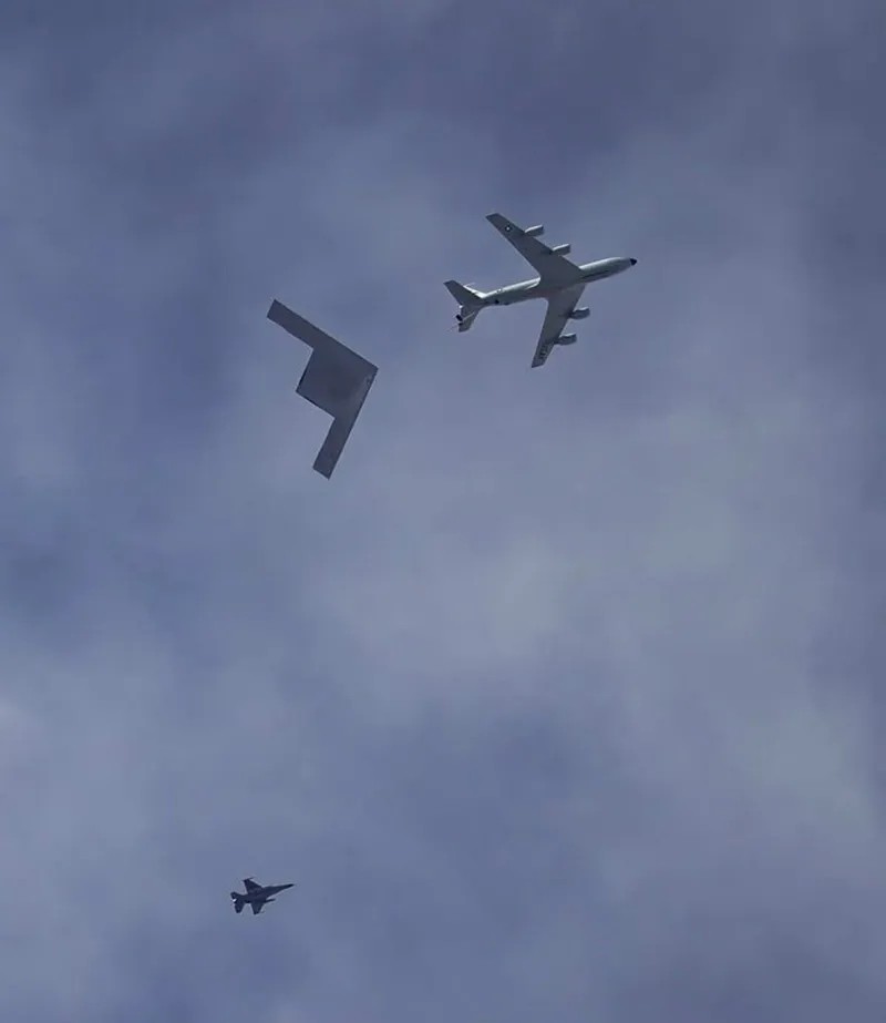 很快,这组“加油机+轰炸机”的编队照片在社交媒体上迅速传播。从照片中还可以看到,一架F-16战斗机充当伴飞护航机。