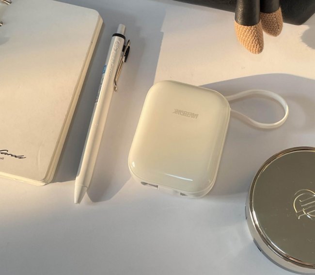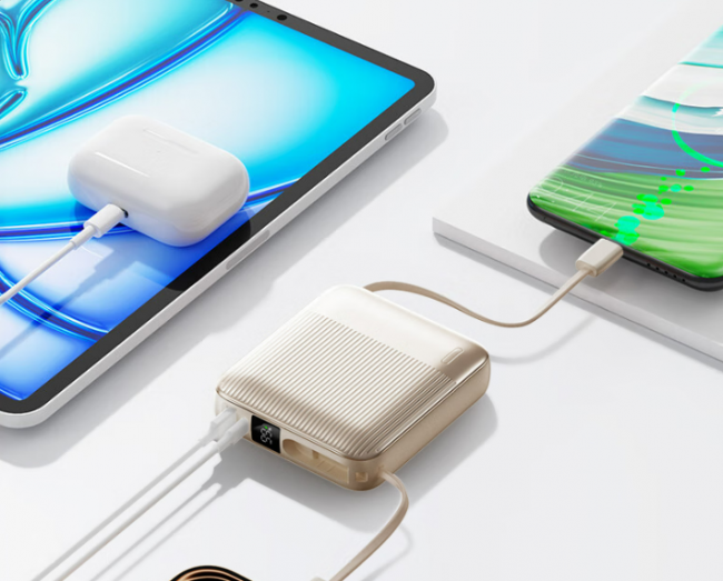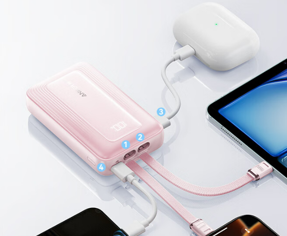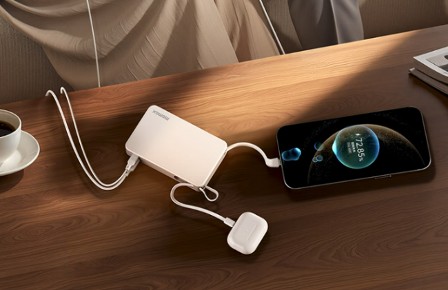 最让我觉得省心的就是它自带线,还是Type-C和Lightning双接口的,我有时候用苹果手机,有时候用安卓平板,不用额外带线,也不用来回换线,直接插上去就能充,收纳起来也不占地方,再也不用为了带线烦恼了。