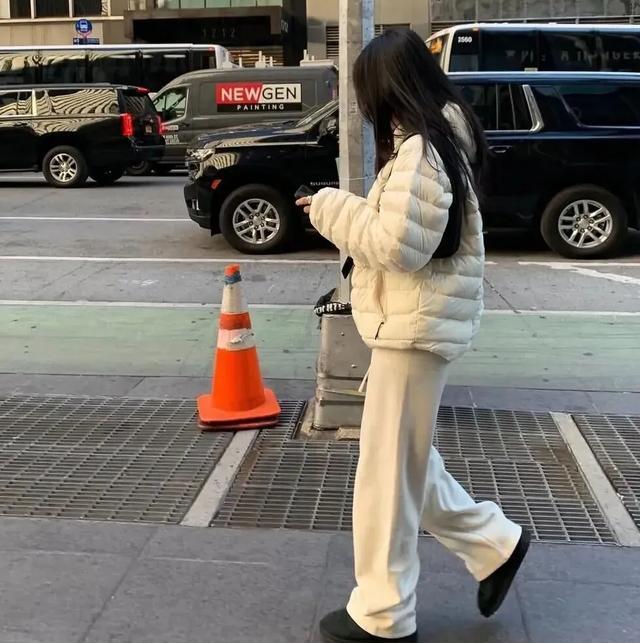 面料和颜色才是她暗藏的机关。冬天衣服厚,垂坠感=生命线。一条高腰阔腿羊毛裤,走路自带风,裤管不贴腿就不会把身高切成两节。颜色更偷懒,全身燕麦色+深咖鞋,像一根连贯的巧克力棒,没有突兀色块打断视线,整个人被拉成一条竖线。
