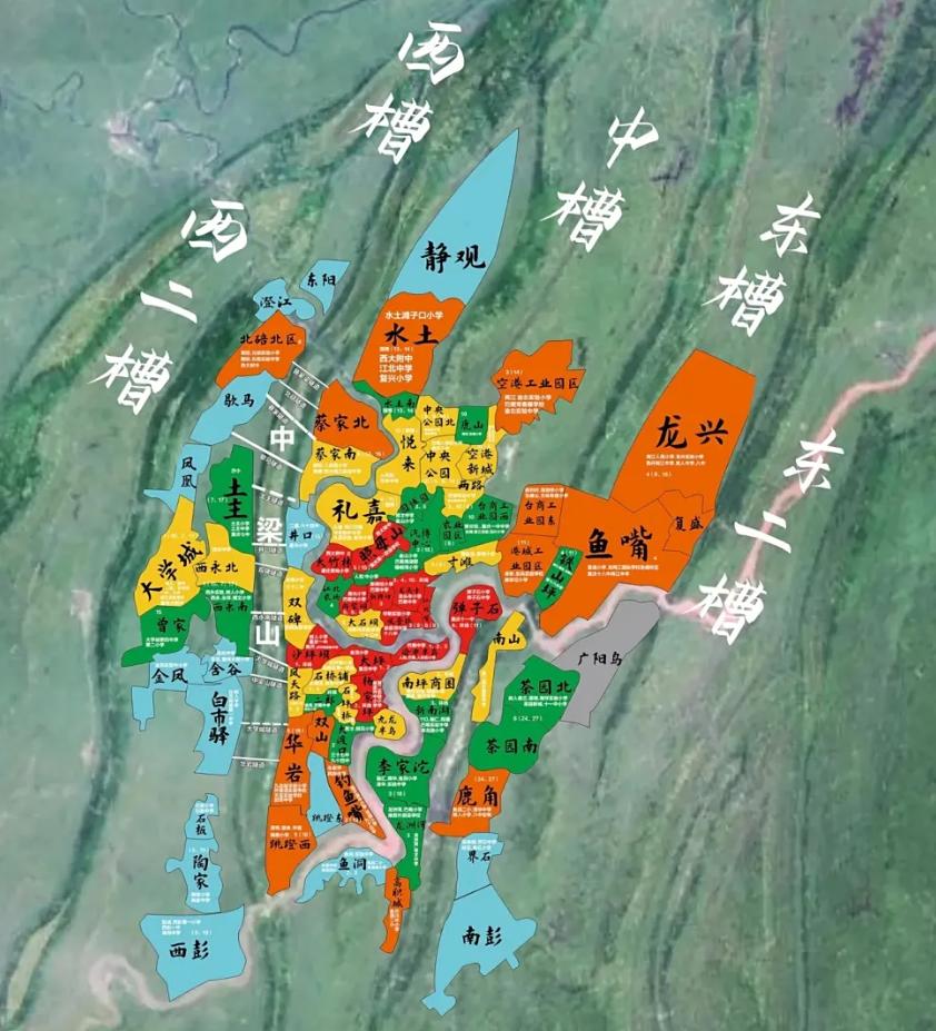 比如重庆的中心城区有缙云山、中梁山、铜锣山、明月山,这四条山脉把重庆切割成了西部、中部、东部三个互不相连的狭长槽谷。