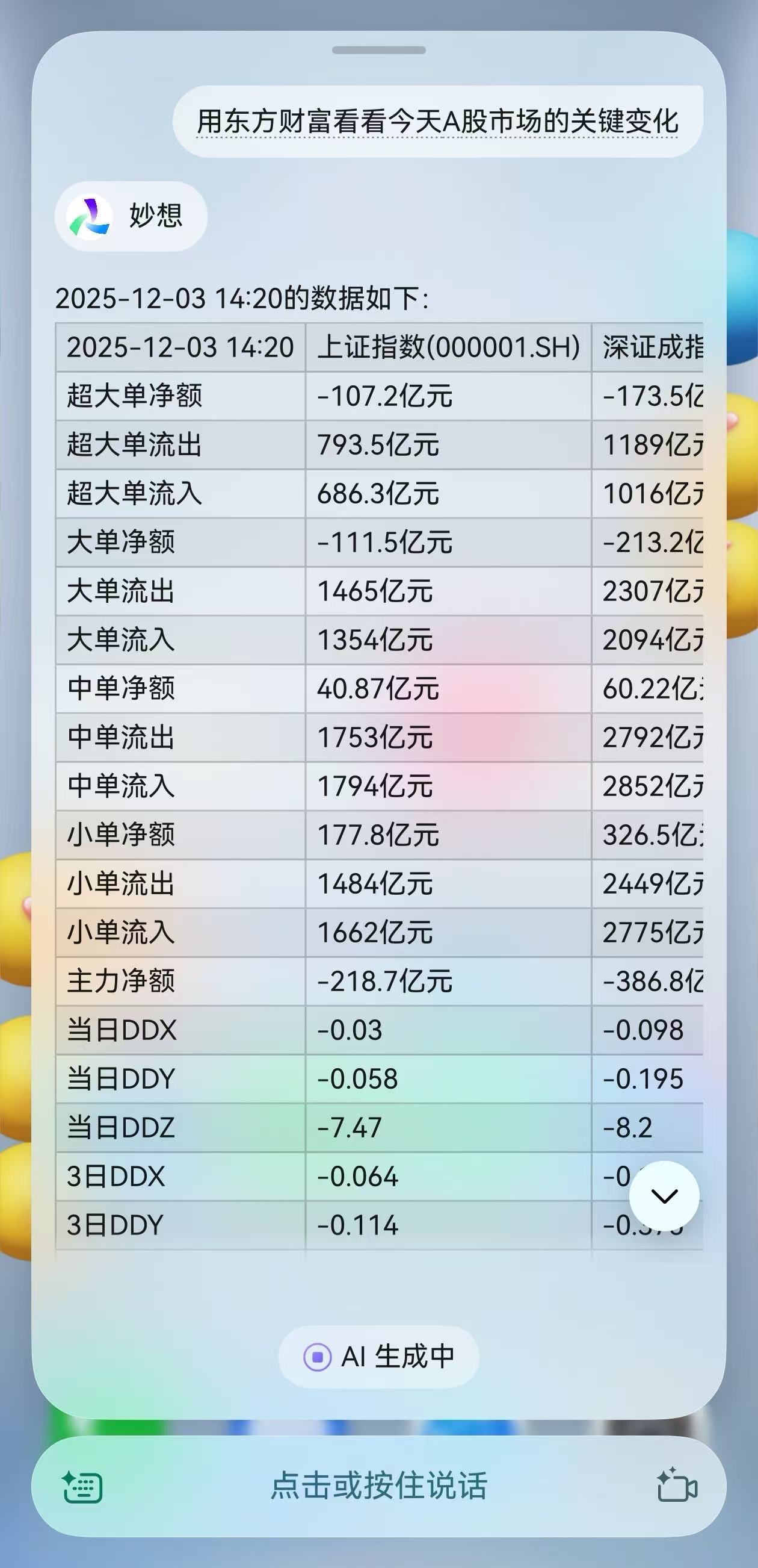 小艺已经集成了东方财富-妙想、华泰股市助手、中金财富投资助手等多个理财类智能体,整理投资信息所需要的大量资讯和专业分析,如今可以通过小艺快速获取。对小艺说“用东方财富看看今天A股市场的关键变化”,妙想智能体就能基于实时行情与宏观数据,生成专业分析、逻辑拆解与可视化结论,把复杂行情“讲成一句话”。