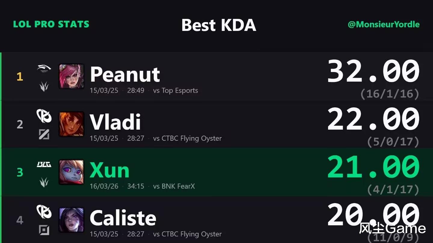 英雄联盟2026先锋赛已经落幕,外媒近日统计了,两届先锋赛的比赛数据,选手单场KDA排行榜单里,已经退役的小花生位列第一,去年HLE交手TES时,Peanut用蔚,砍下了单场32的KDA,比排名第二的Vladi,足足高了10点之多,滔搏哥虽然今年没参赛,但去年创造的纪录无人能破。