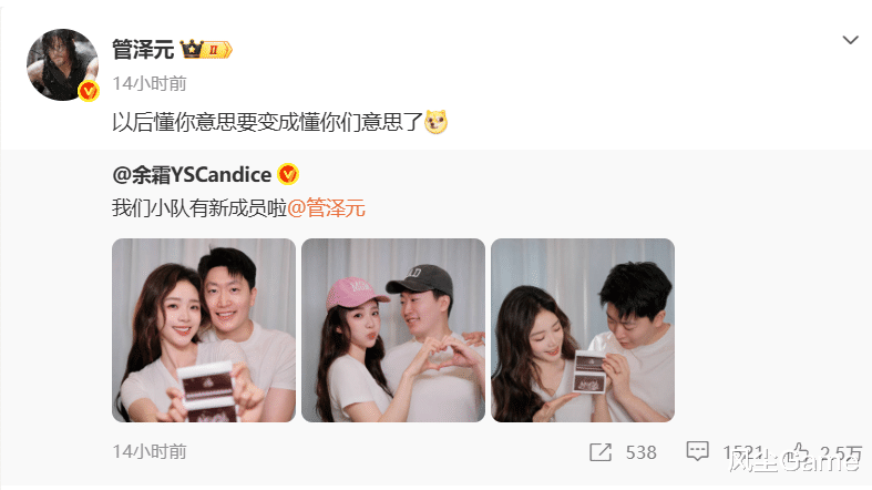 前段时间Rookie和小钰分手,在撸圈引发热议,两个人谈了9年,最后分道扬镳,很多人都觉得遗憾,甚至有人调侃不相信爱情了,但LPL另一对,已经结了婚的金童玉女,近日宣布了一个好消息,主持一姐余霜发文喊话管泽元:我们的小队有新成员啦,管泽元也回应:懂你变懂你们了。