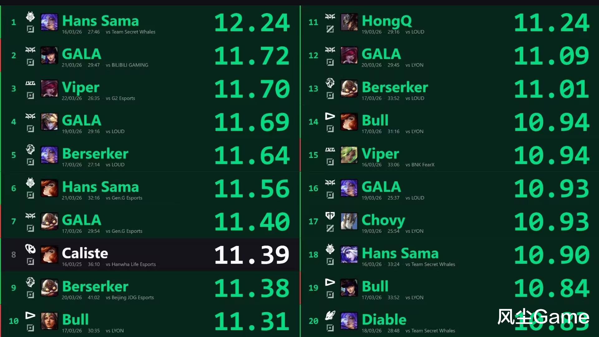 除了KDA之外,外网还统计了单场分均补刀,前十的榜单里,居然没看到大超的身影,看来今年的Chovy,补刀已经是不行了,排第一的是G2的AD,他用芸阿娜,刷出过单场12.24的补刀数,第二和第三,都是LPL的选手,京东的嘎子,BLG的老公,两个人刀差只有0.02,非常的接近。