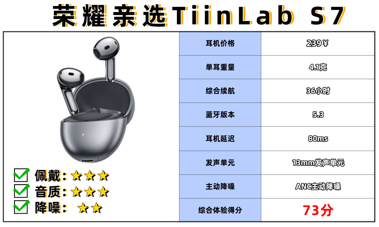 6、荣 耀 亲 选TiinLab S7蓝牙耳机